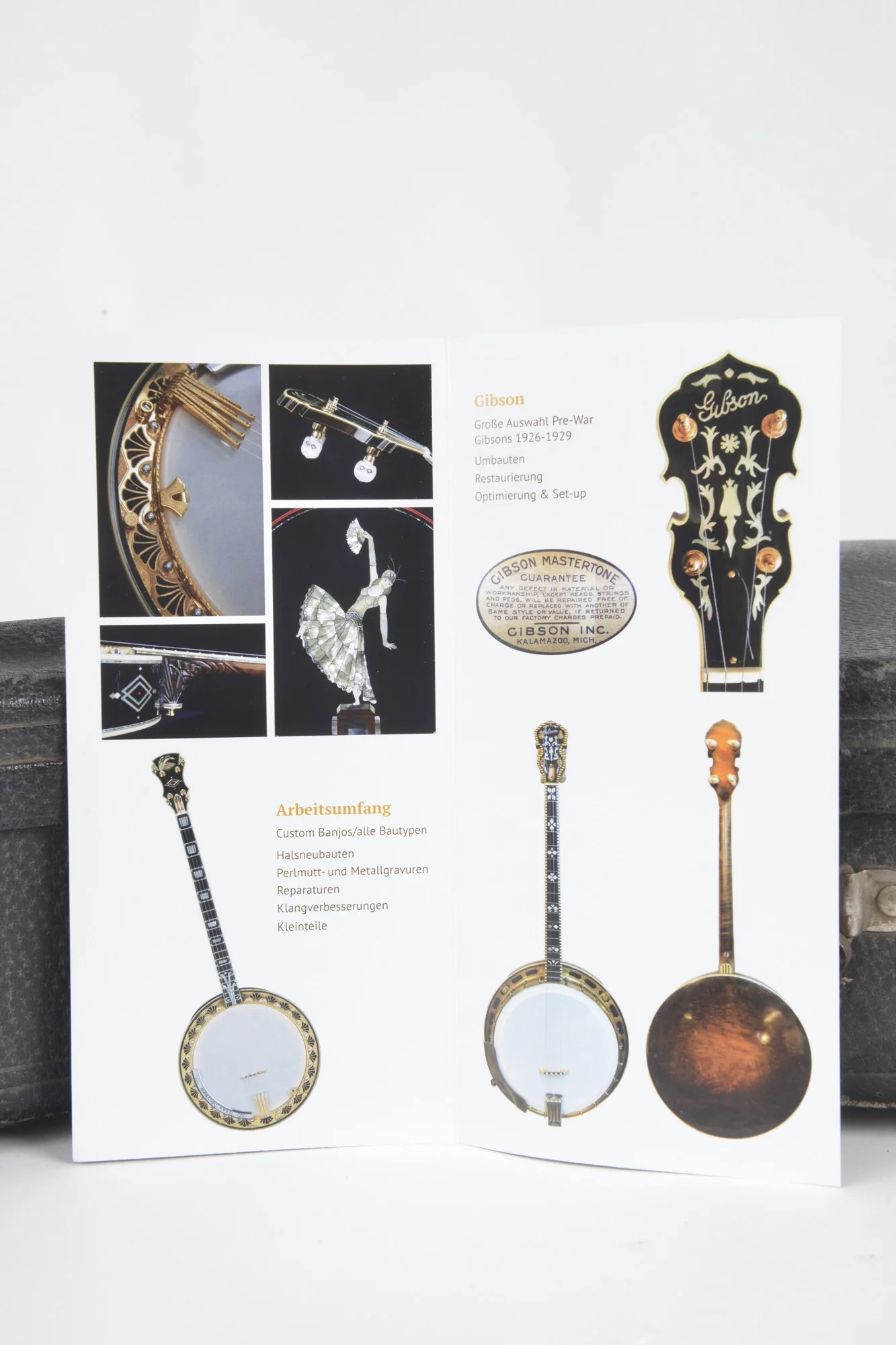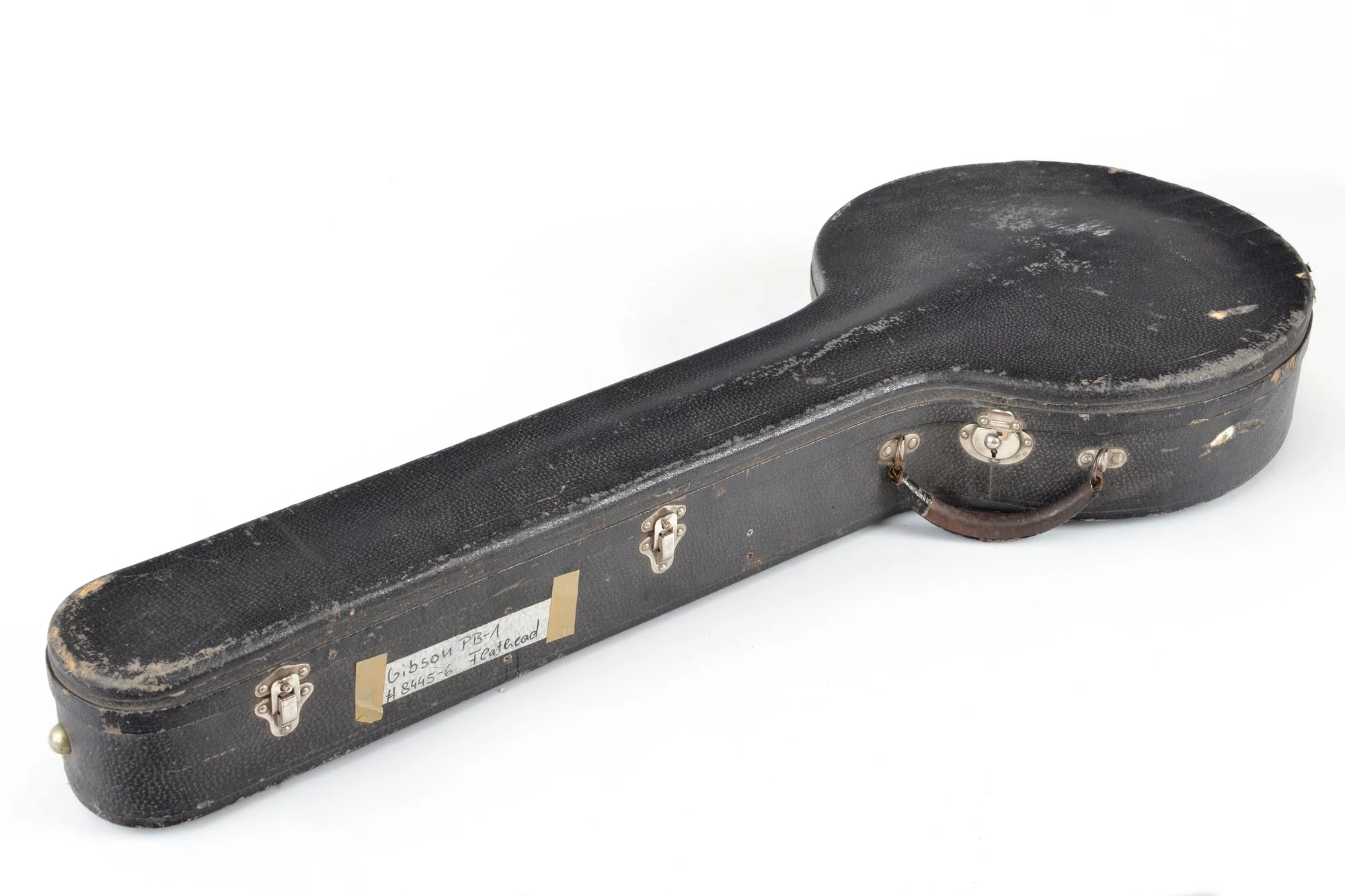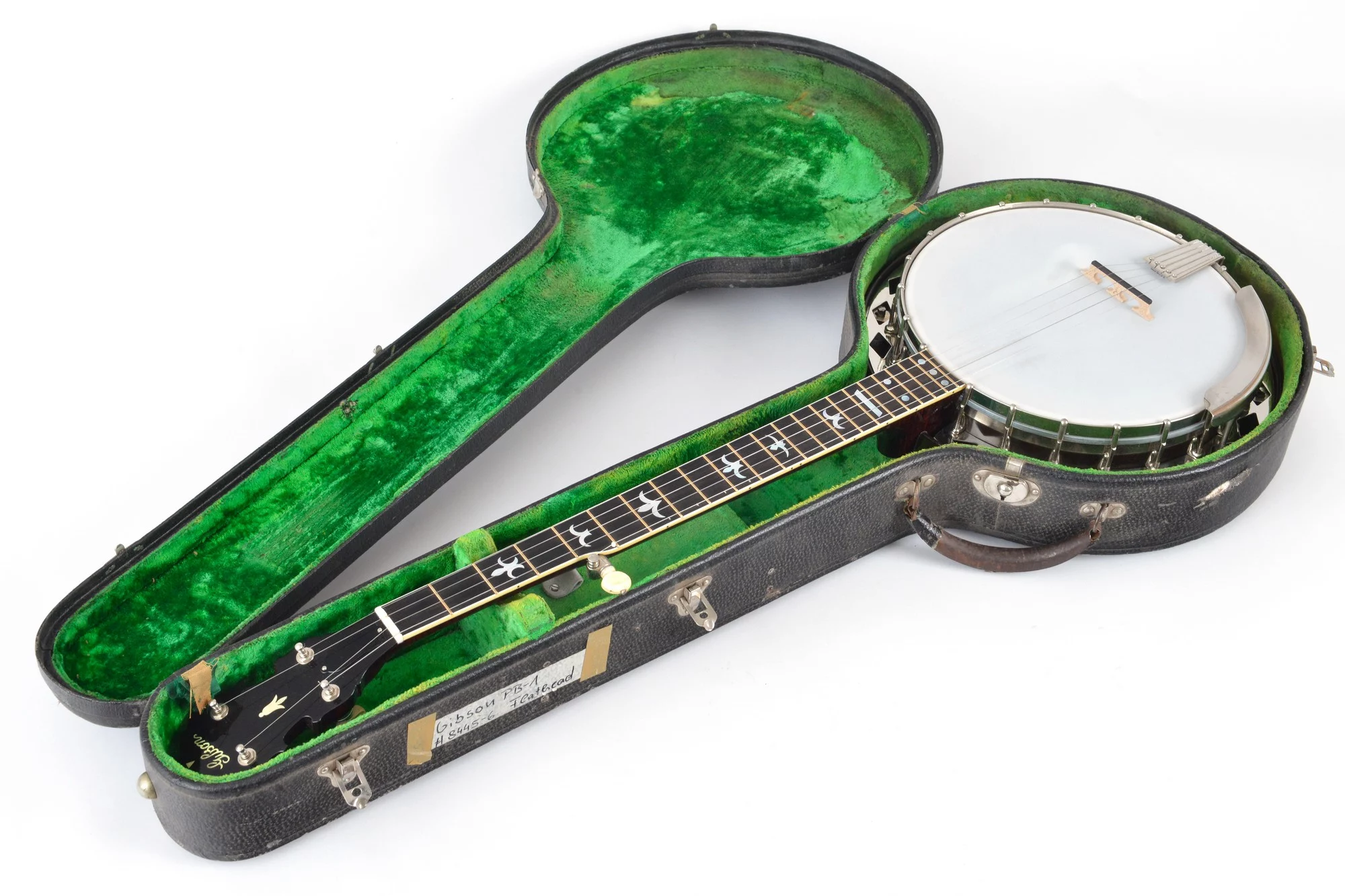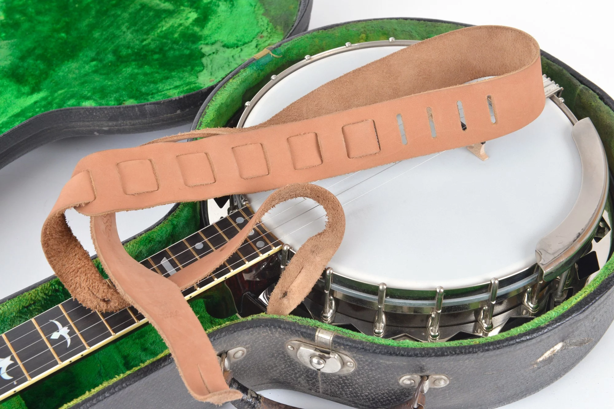The banjo comes with a leather strap and a vintage Gibson plectrum case
