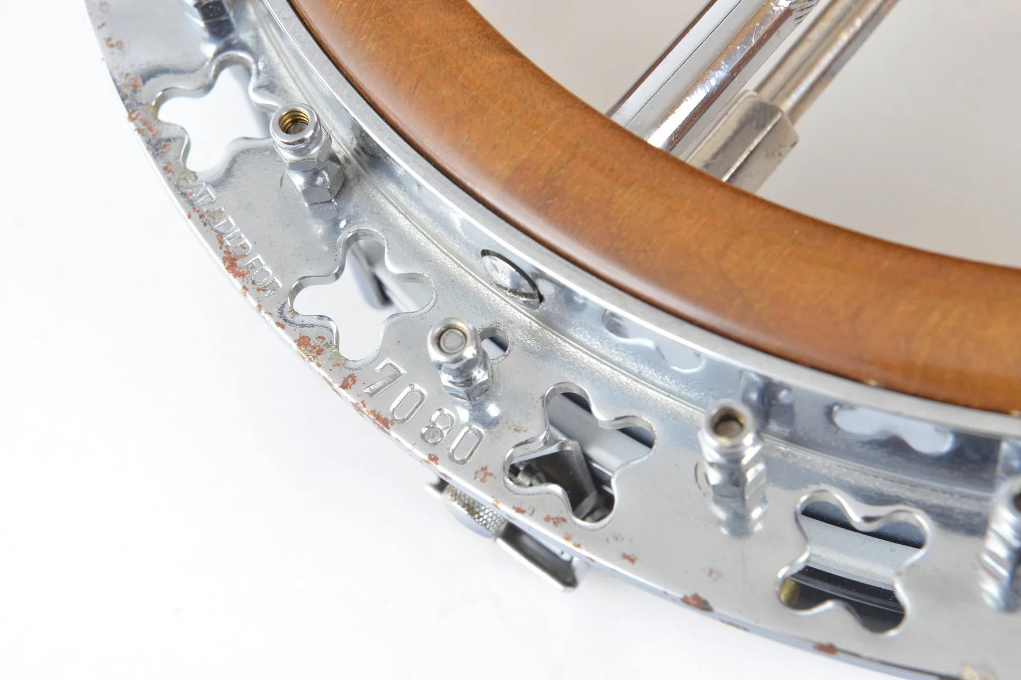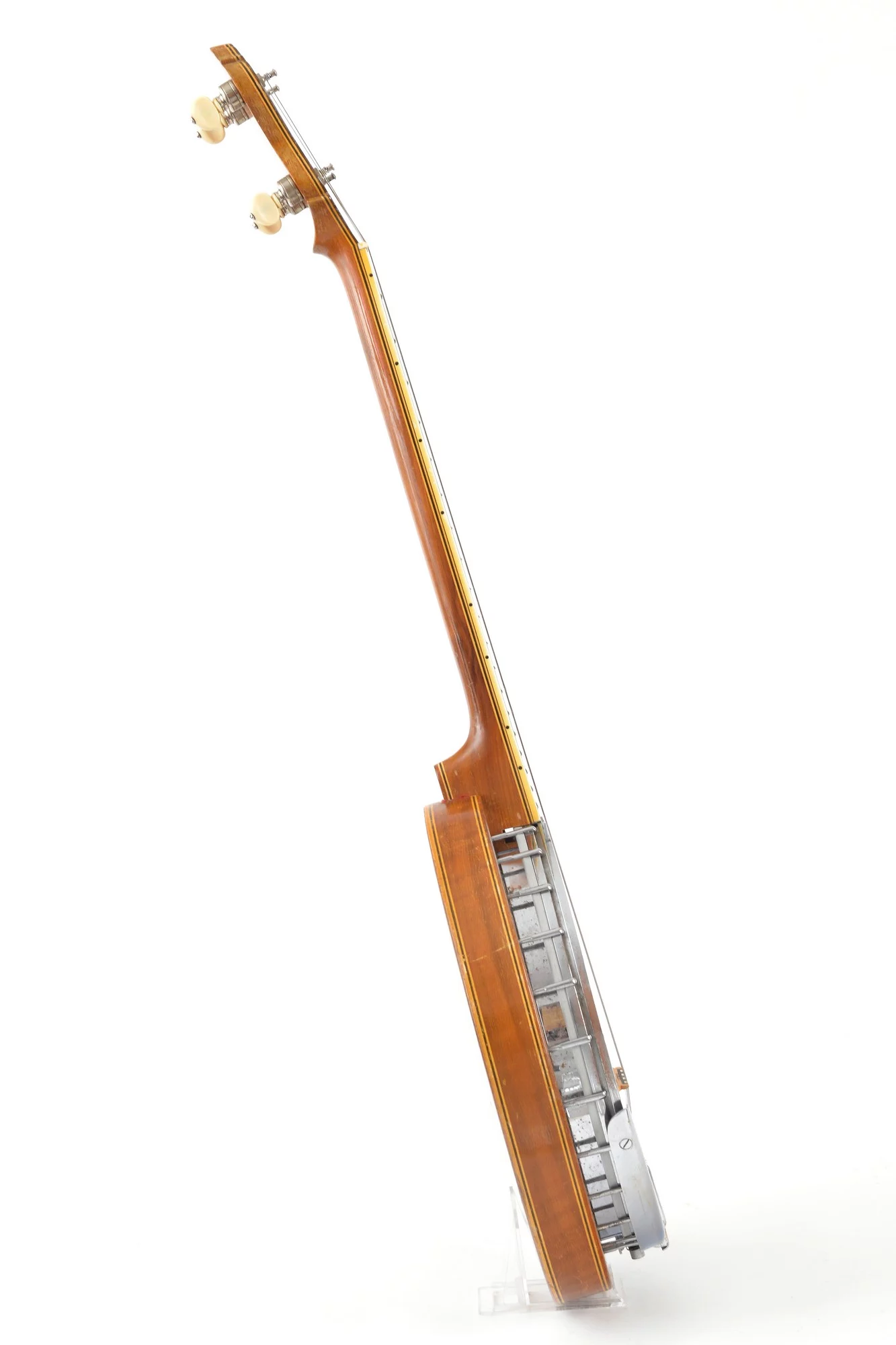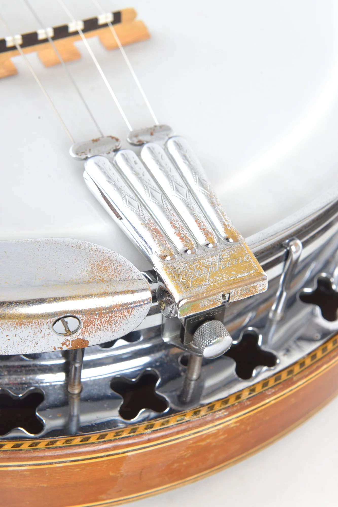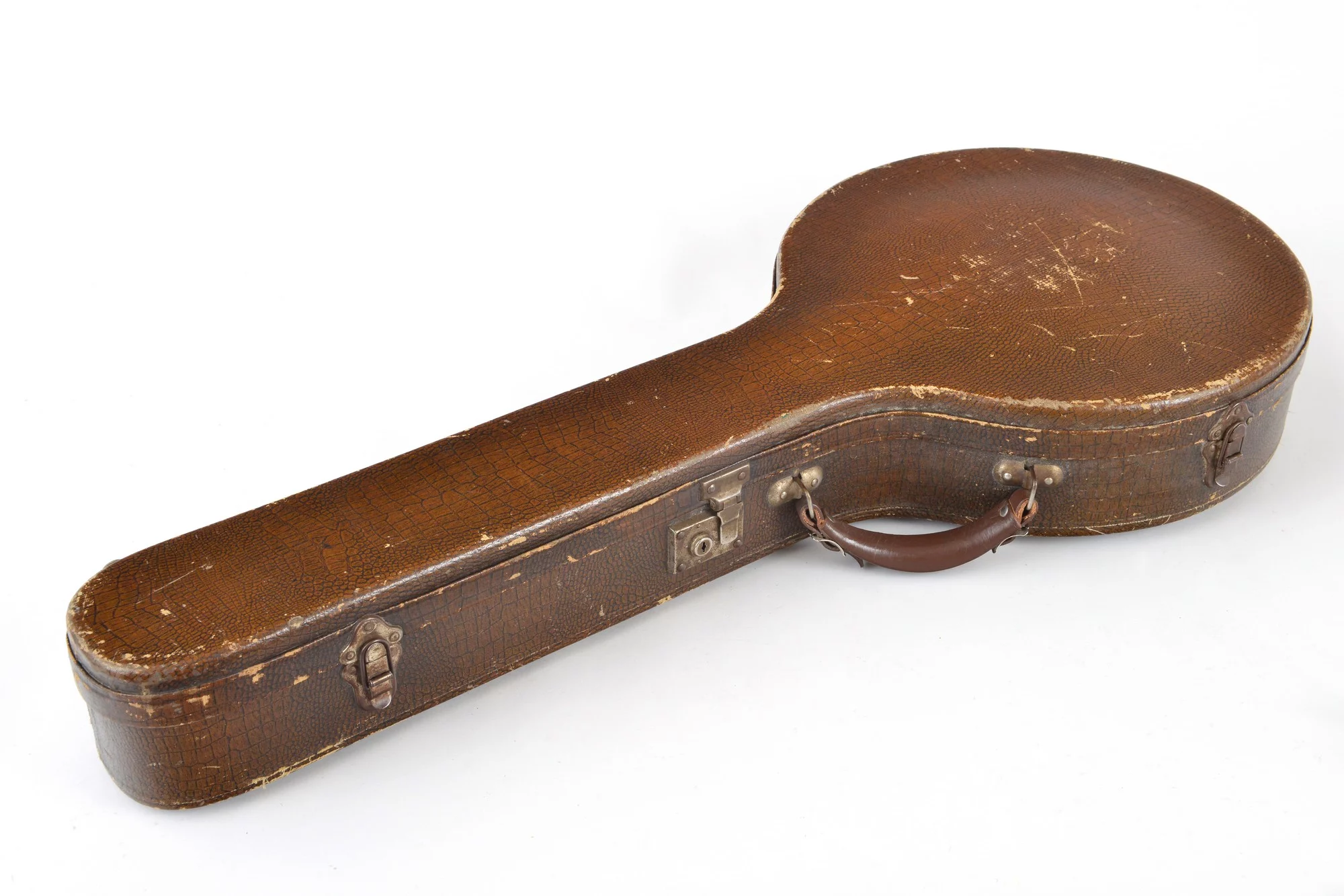 Serial 7080 stamped on the flange. Several signs of use and age on the surface (esp. on the resonator). Nice string action. Clear and crisp sound. Comes with a heavily used case.