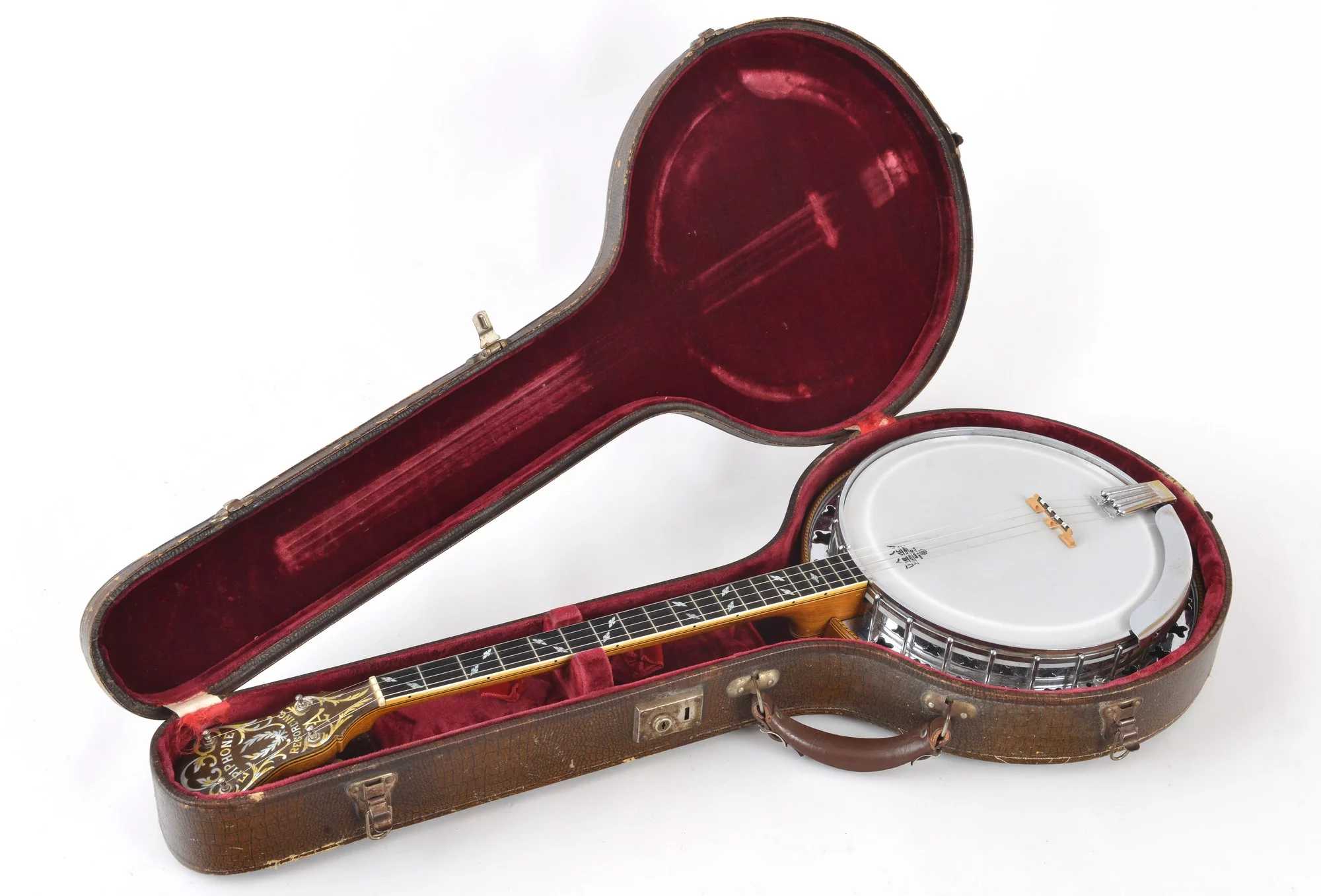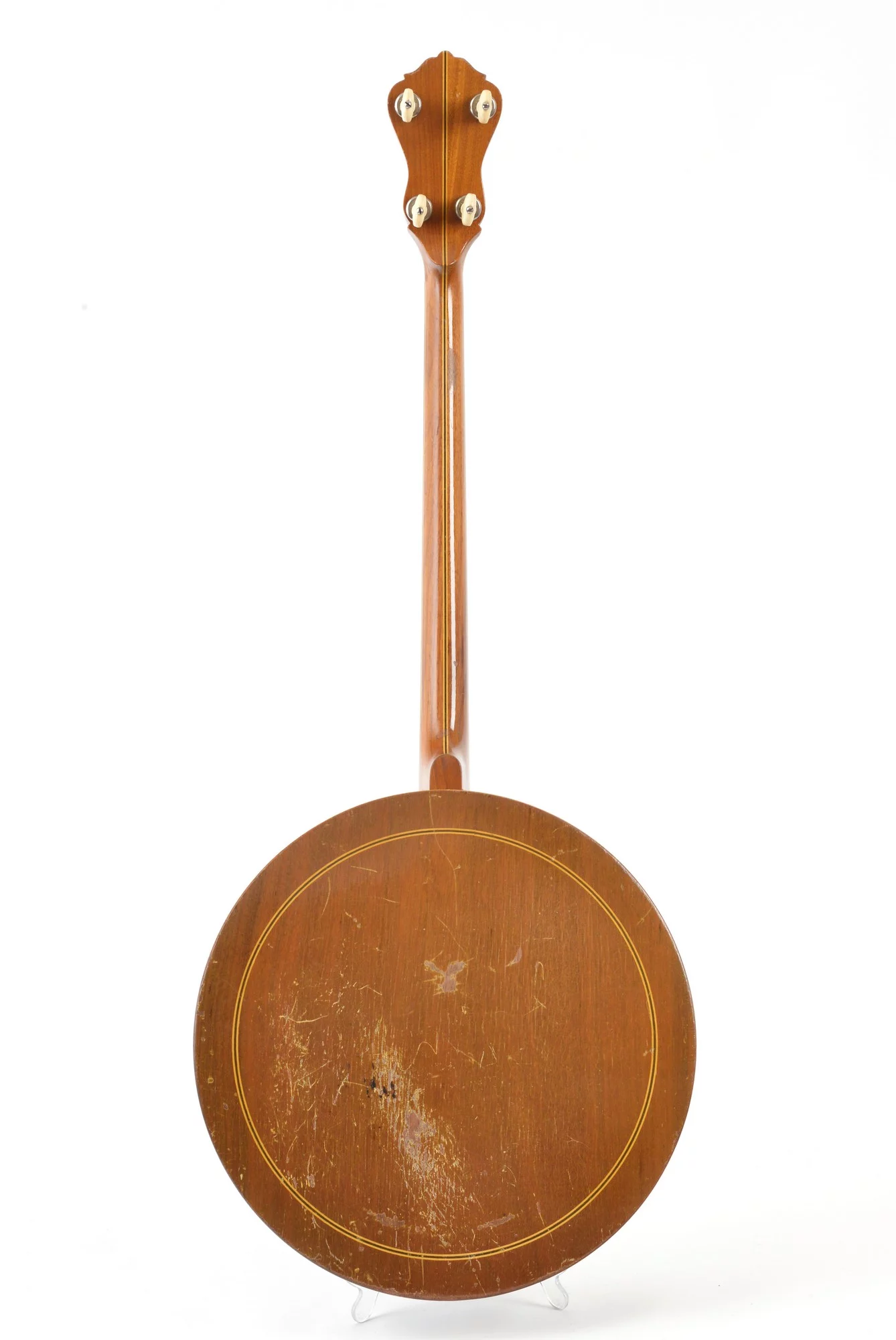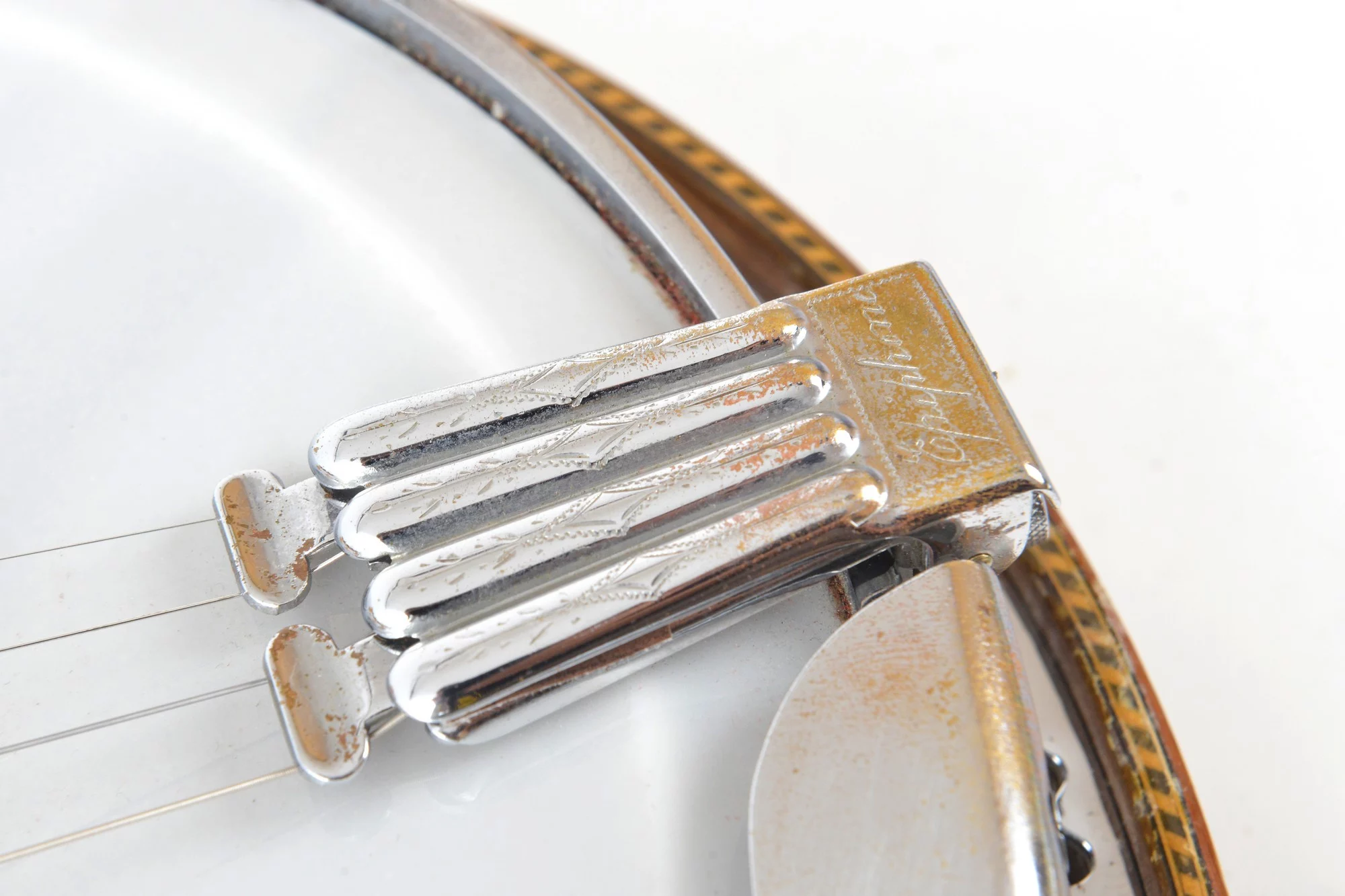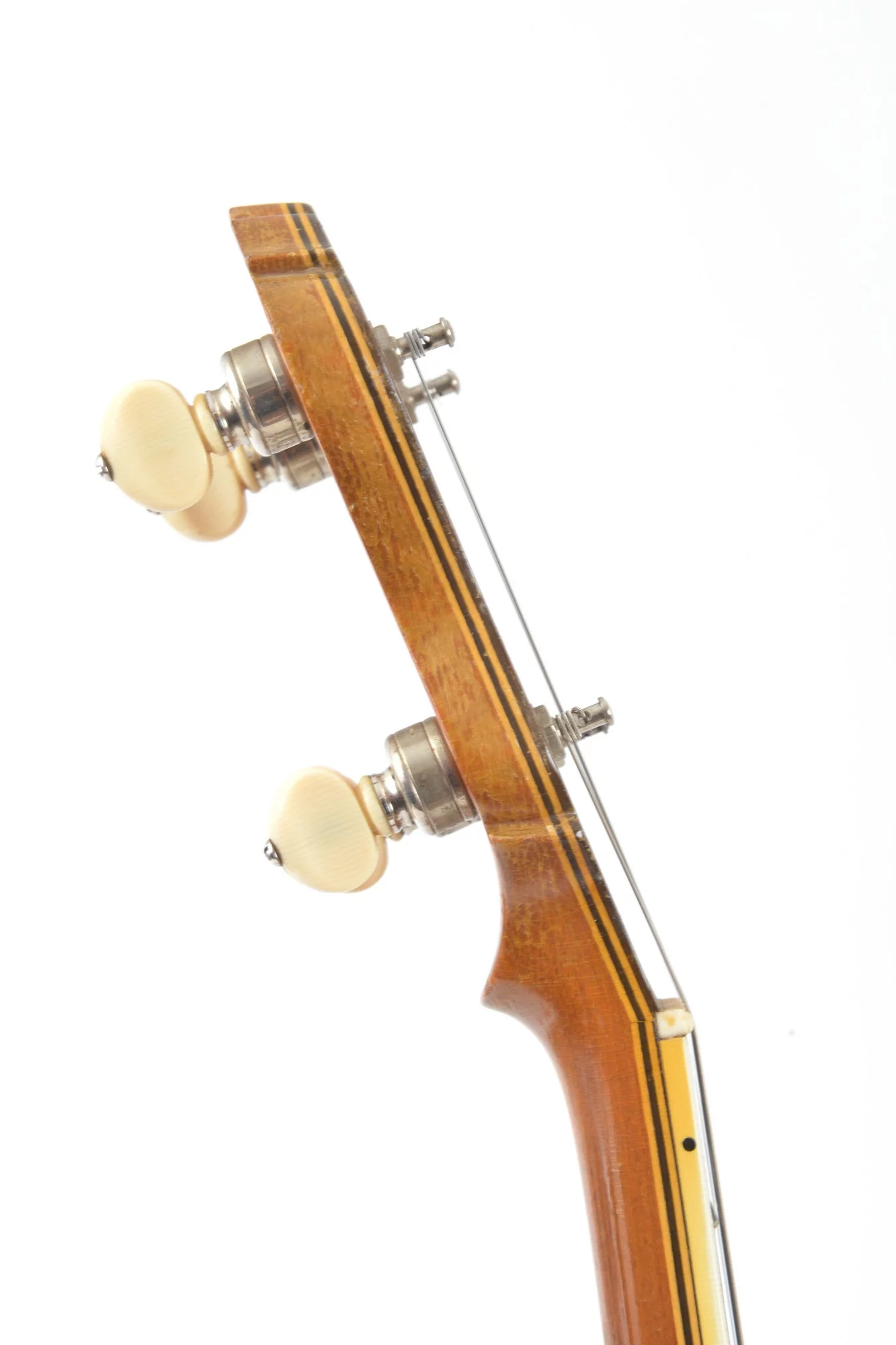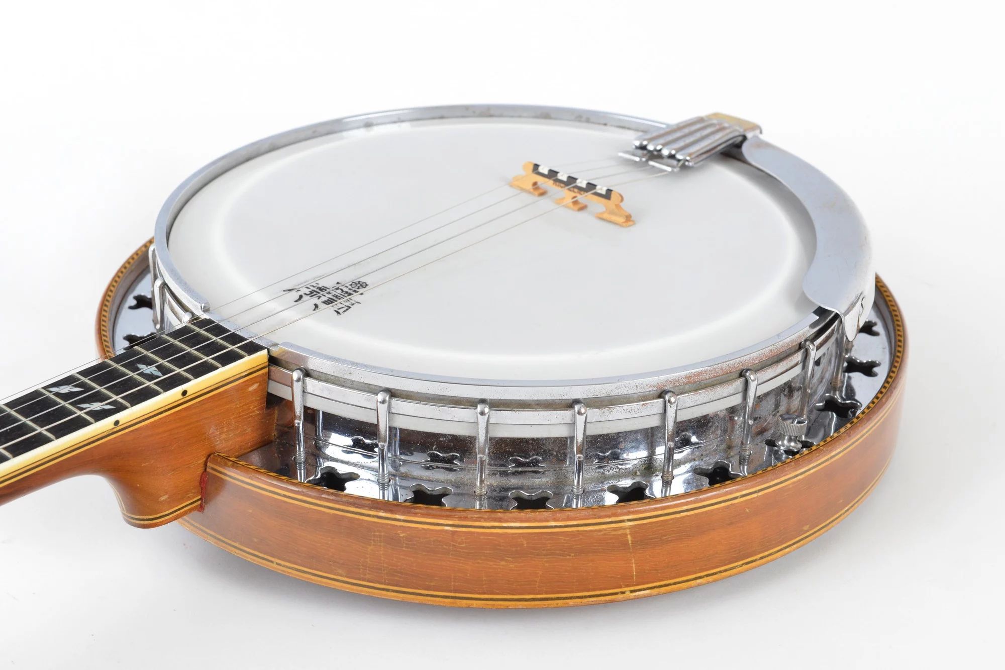 Serial 7080 stamped on the flange. Several signs of use and age on the surface (esp. on the resonator). Nice string action. Clear and crisp sound. Comes with a heavily used case.