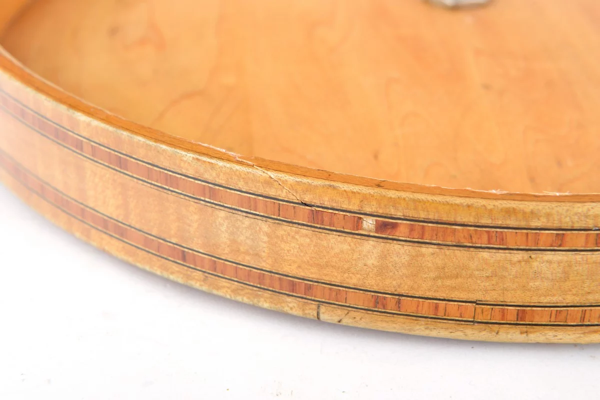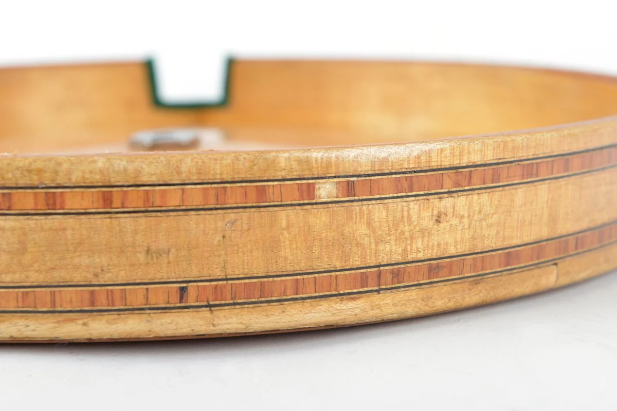 The instrument is ready to play with some minimal signs of age and use. Only the resonator has 2 minimal losses in the veneer and a restored part at the edge.