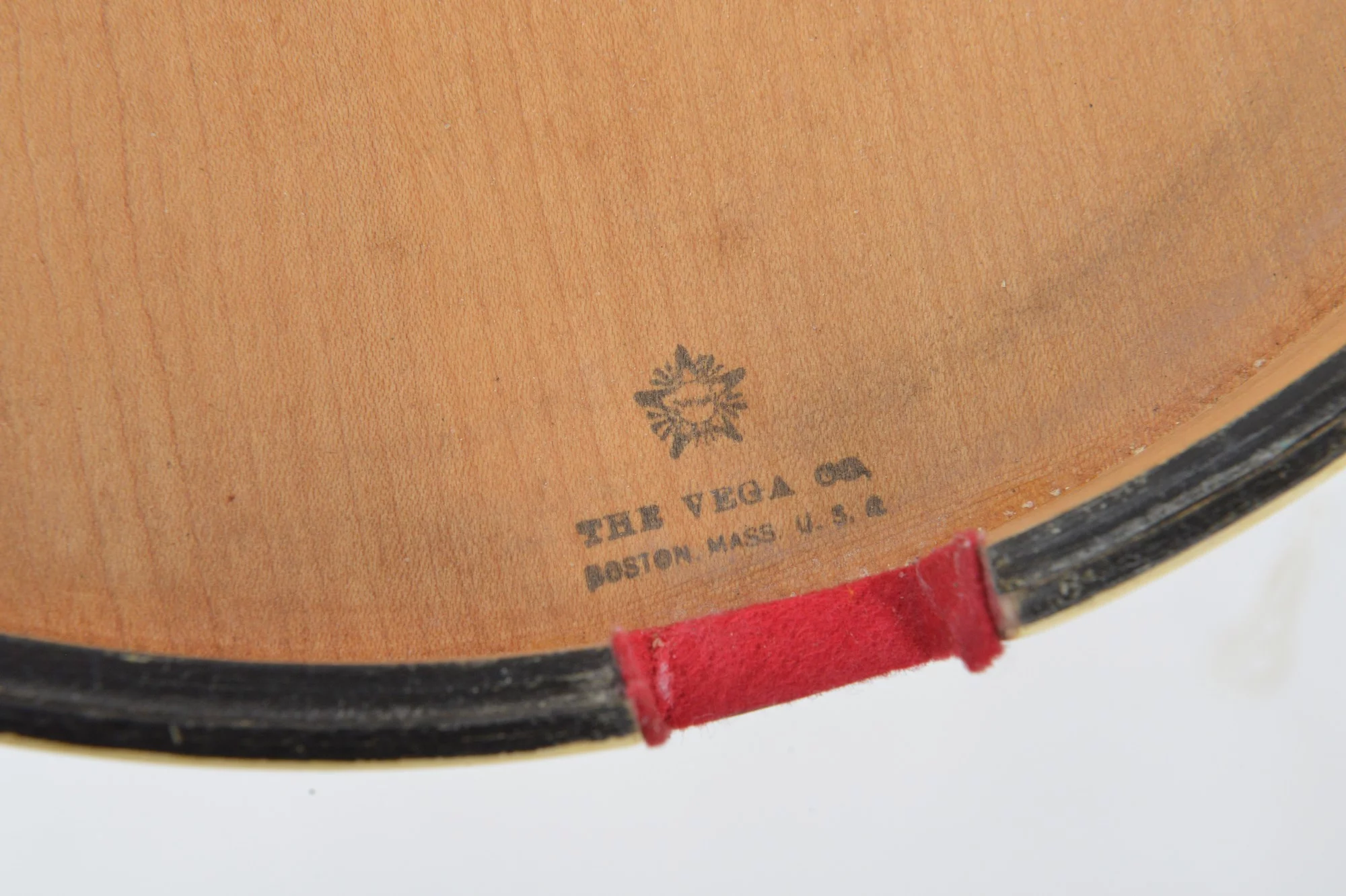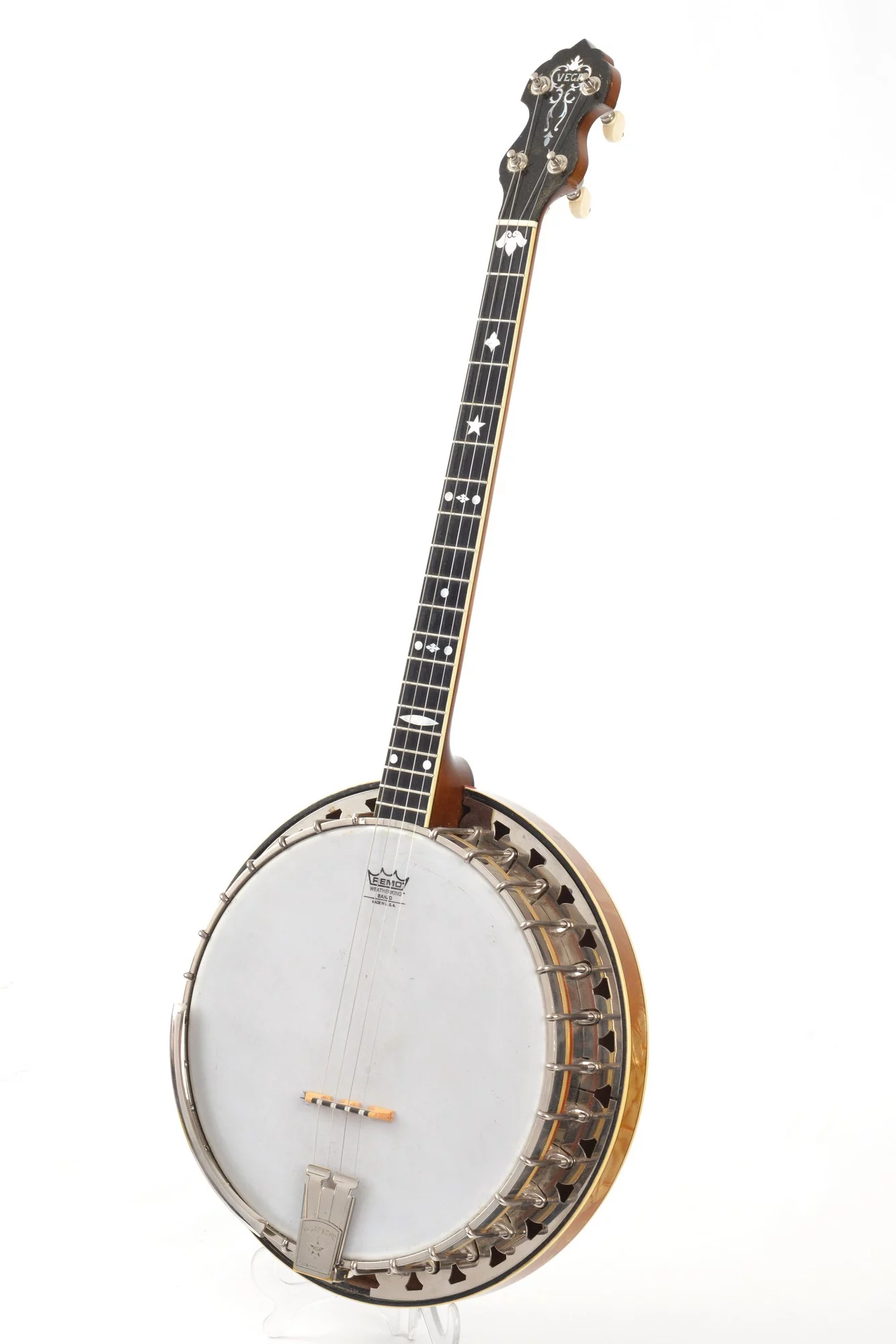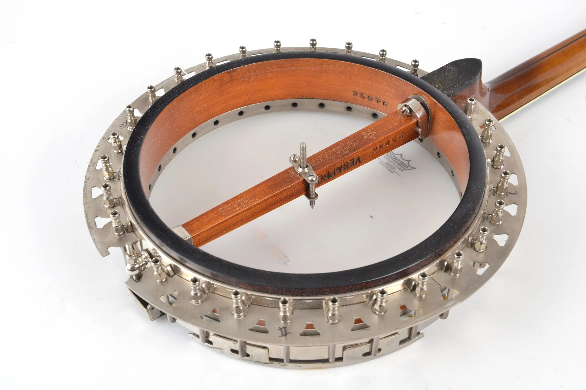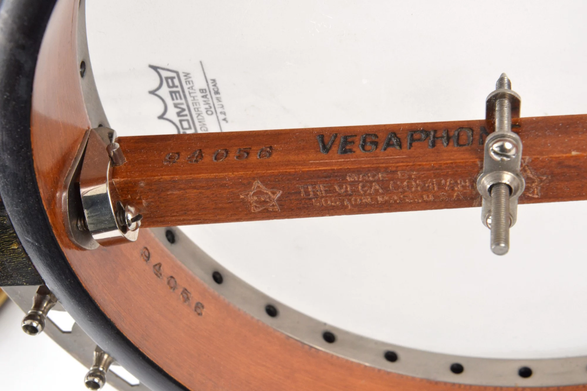 19-fret tenor banjo made by Vega in 1928. The serial number is 94056, stamped on the dowelstick and rim.
