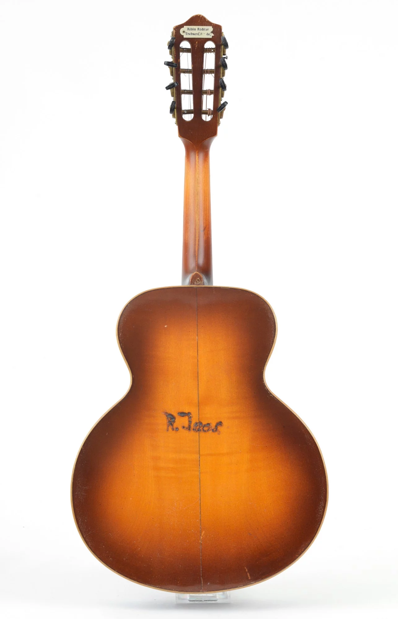 The guitar-shaped body shows various signs of age and wear, such as scratches, scuffs, restored cracks in the top, and damage to the finish. A true living history book! On the back, an “R. Joos” has also been branded into the wood. On the back of the pegbox is a plaque inscribed with “Albin Richter Trebsen (Mulde).”