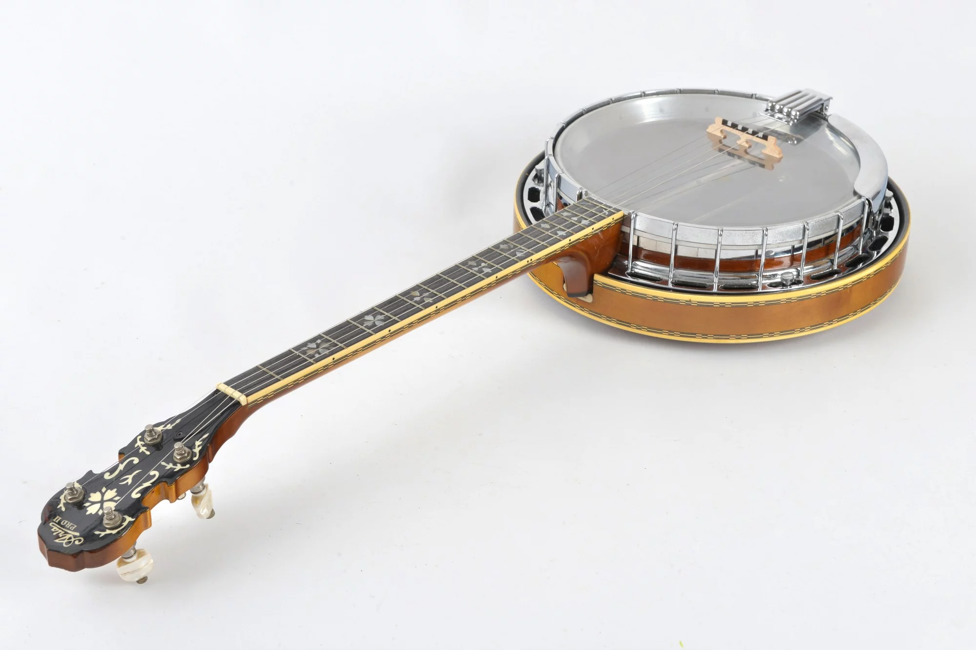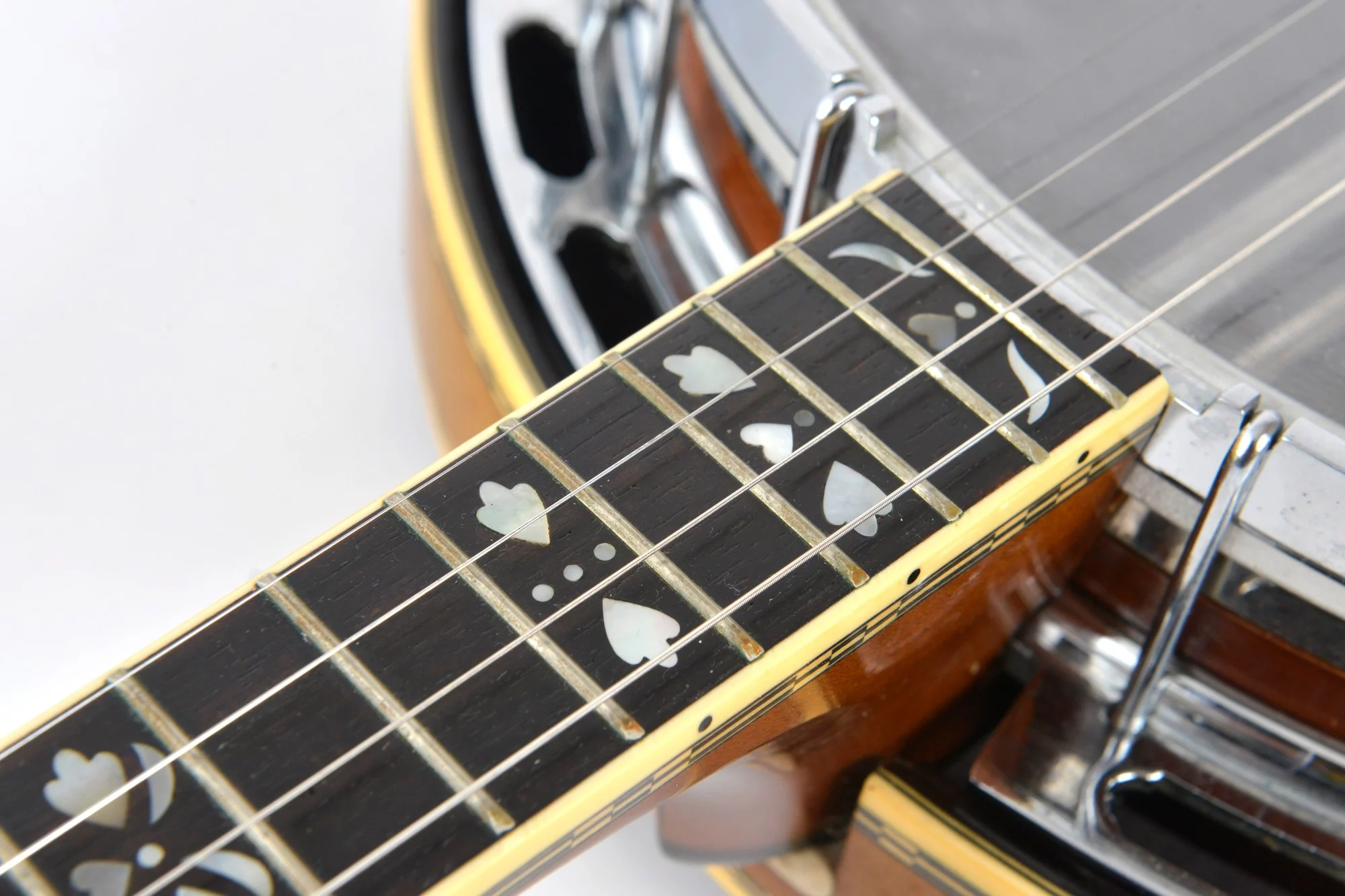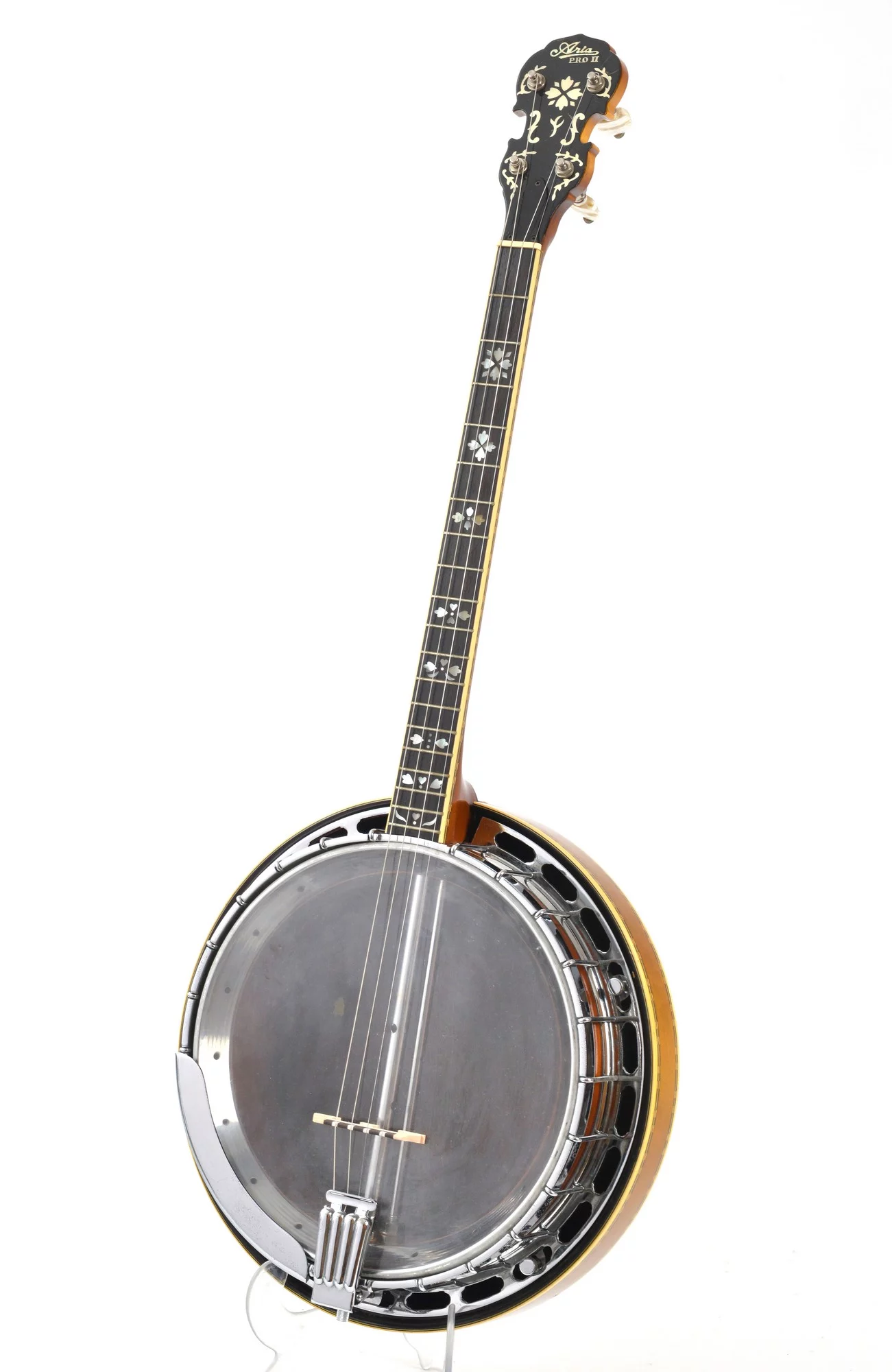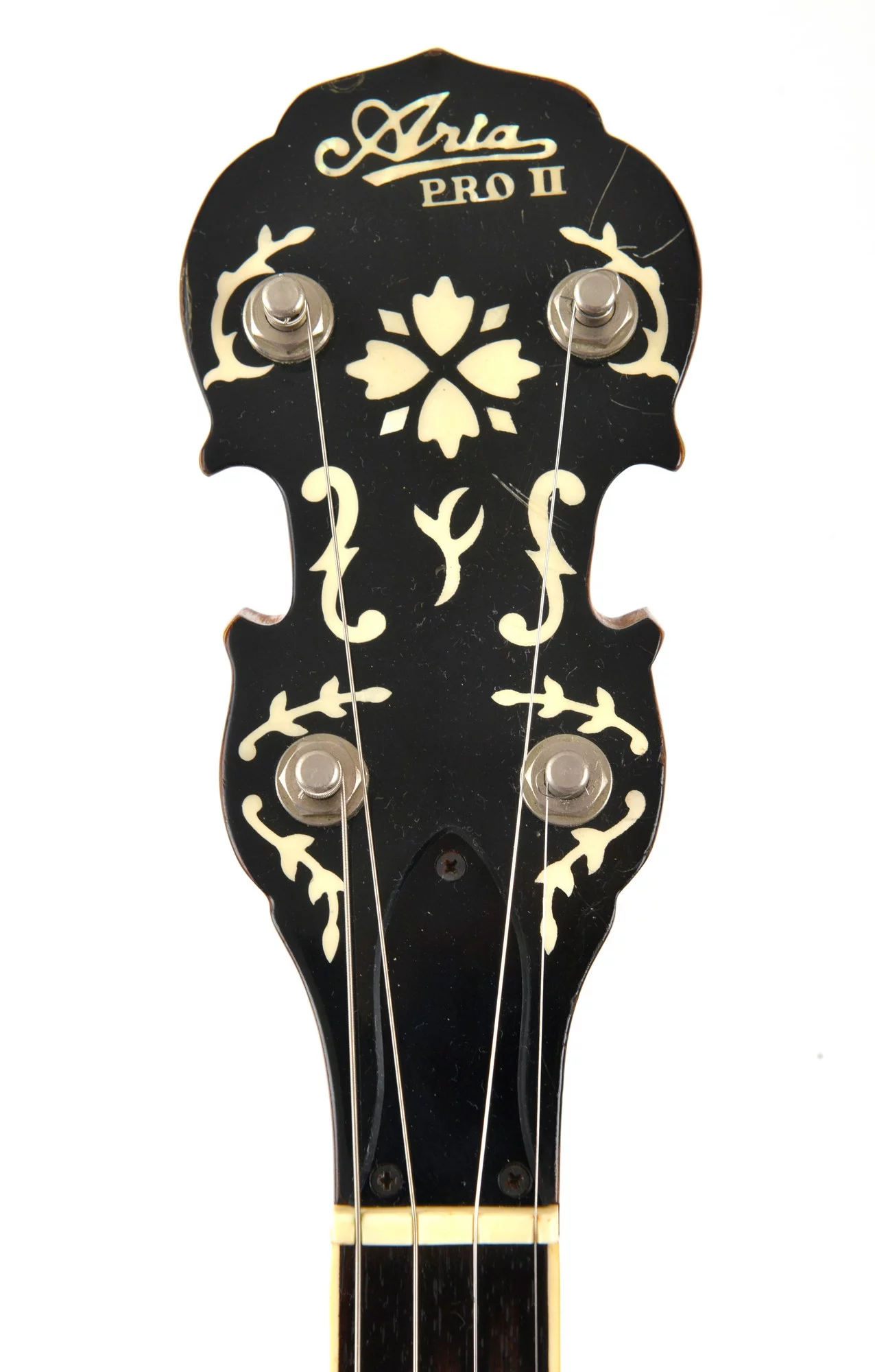 Beautifully preserved Japanese tenor banjo by Aria from the 1970s. A typical heavy Mastertone copy with flathead tone ring, which can easily keep up with the originals in terms of sound. Hearts and Flowers neck inlay, Clamshell tailpiece, CGDA stringing. Without case. Ready to play.