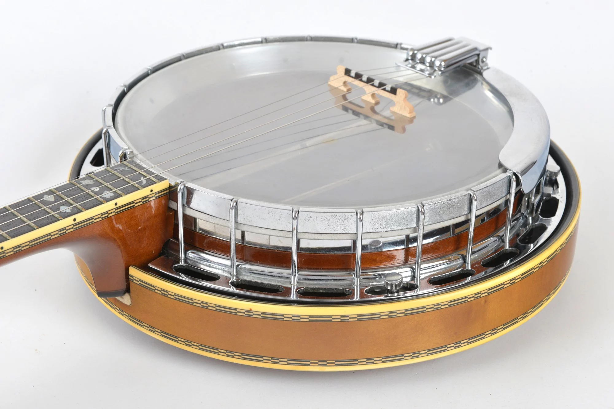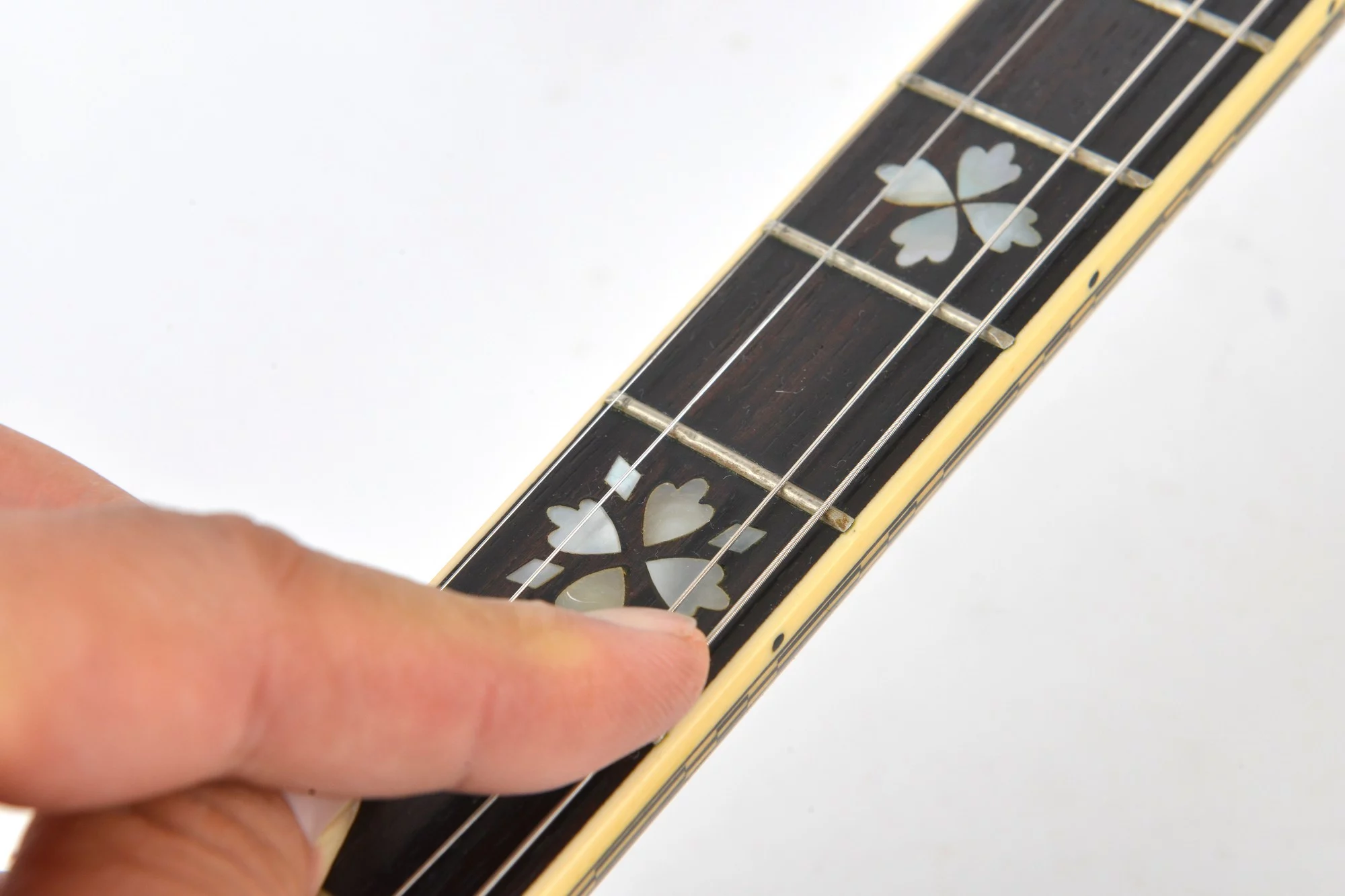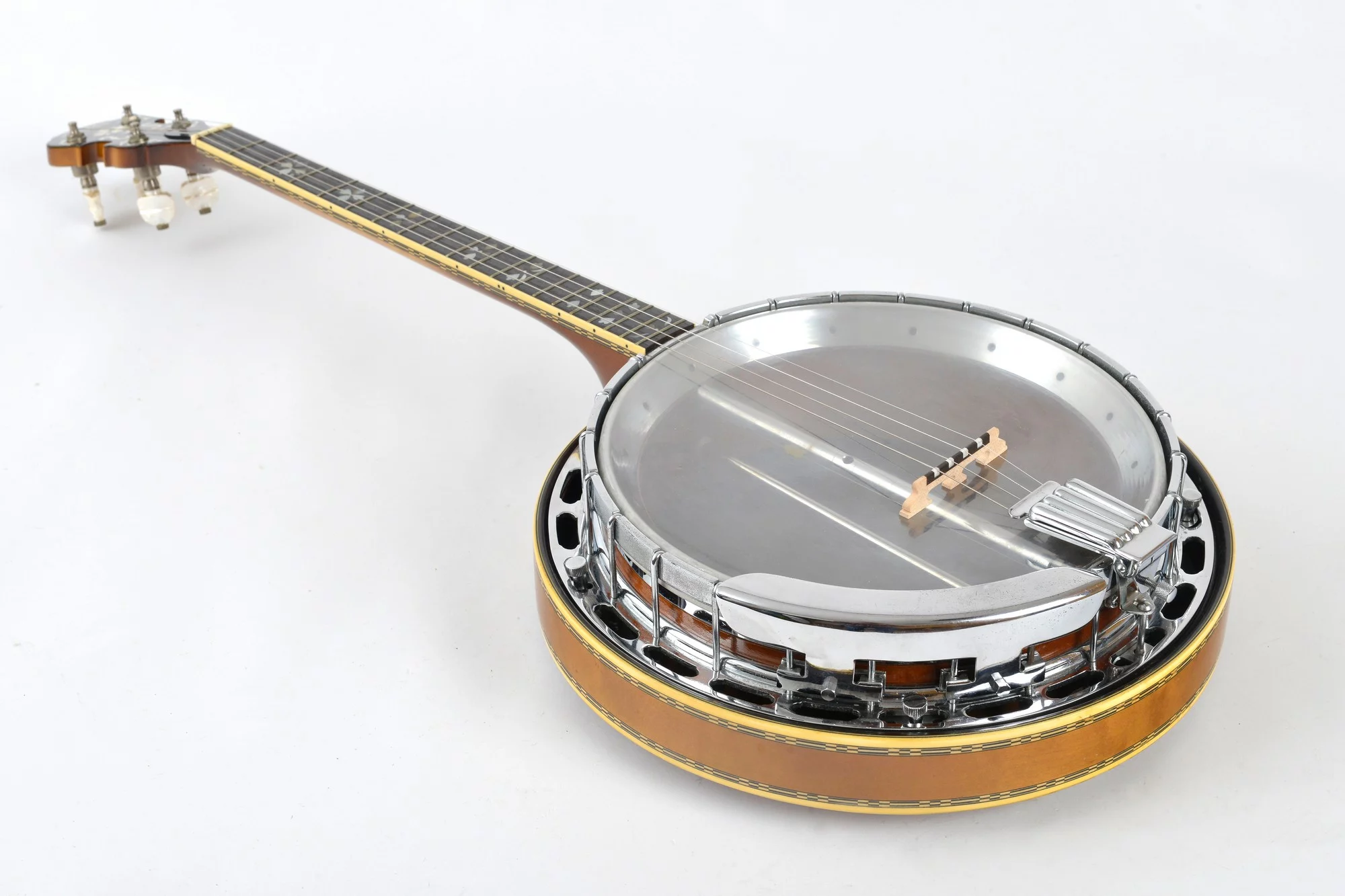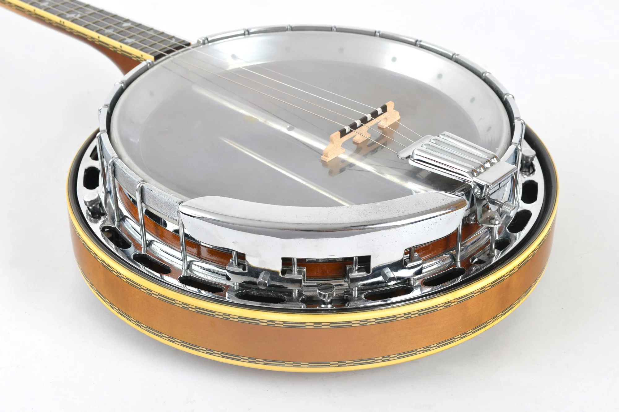 Beautifully preserved Japanese tenor banjo by Aria from the 1970s. A typical heavy Mastertone copy with flathead tone ring, which can easily keep up with the originals in terms of sound. Hearts and Flowers neck inlay, Clamshell tailpiece, CGDA stringing. Without case. Ready to play.