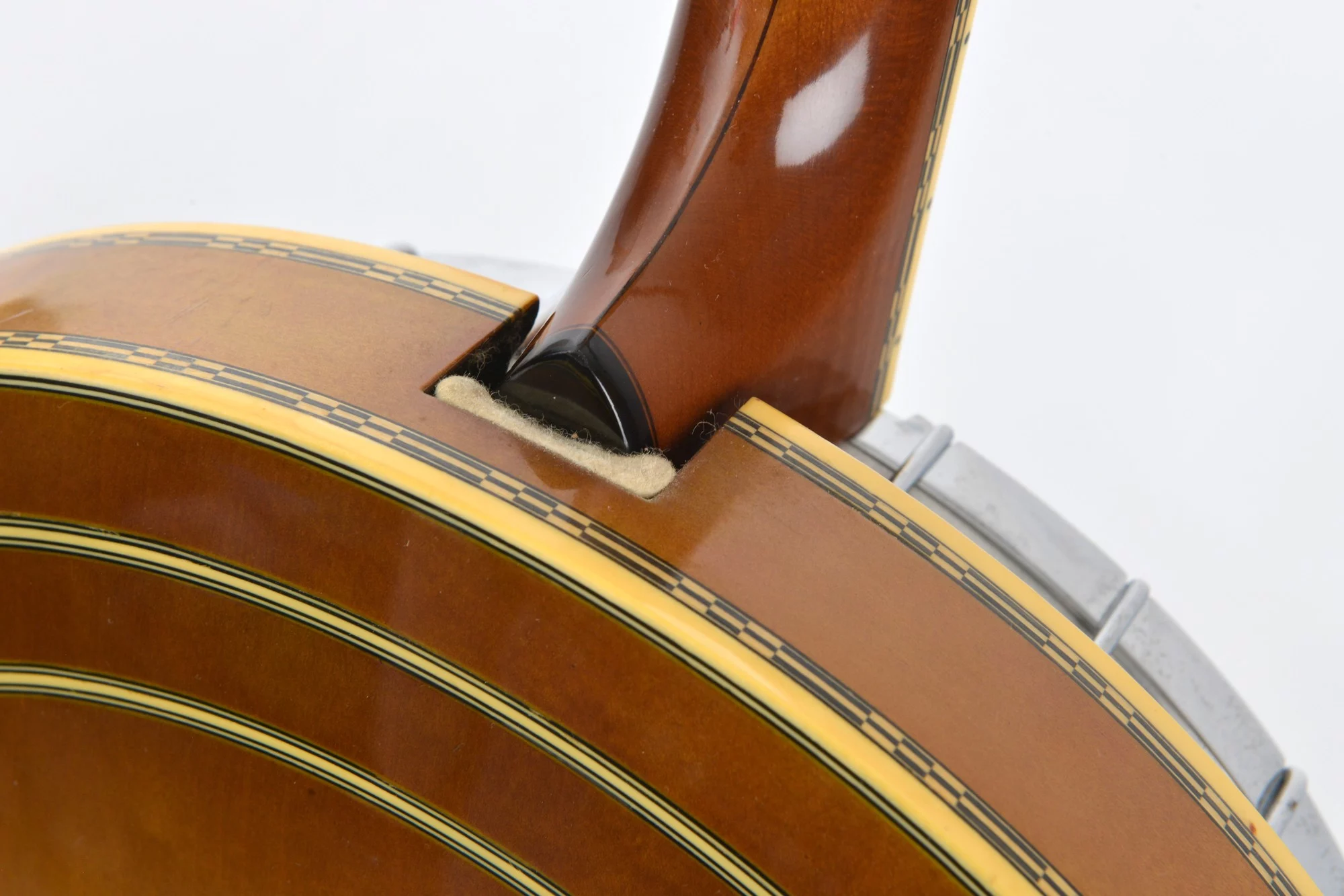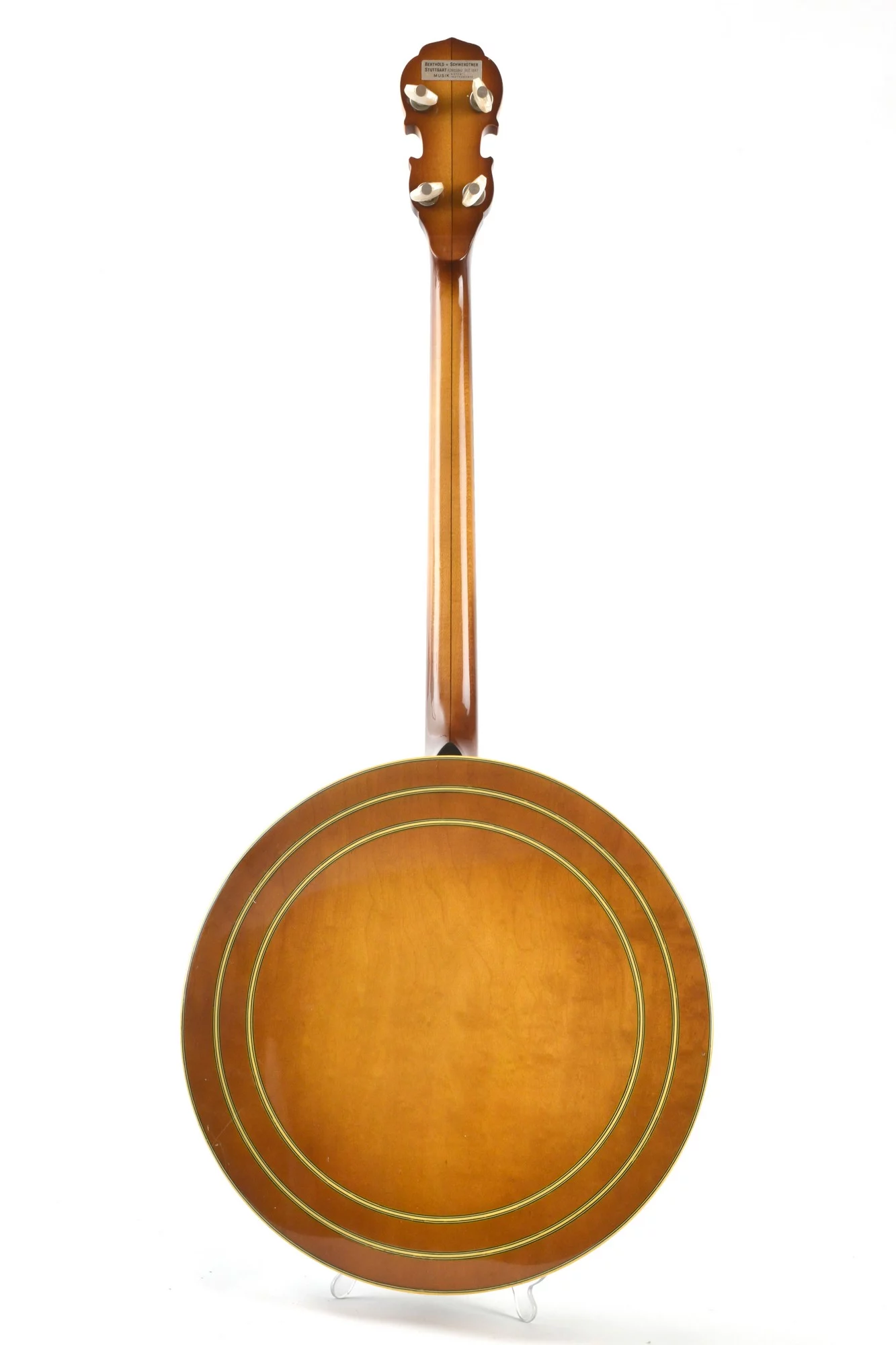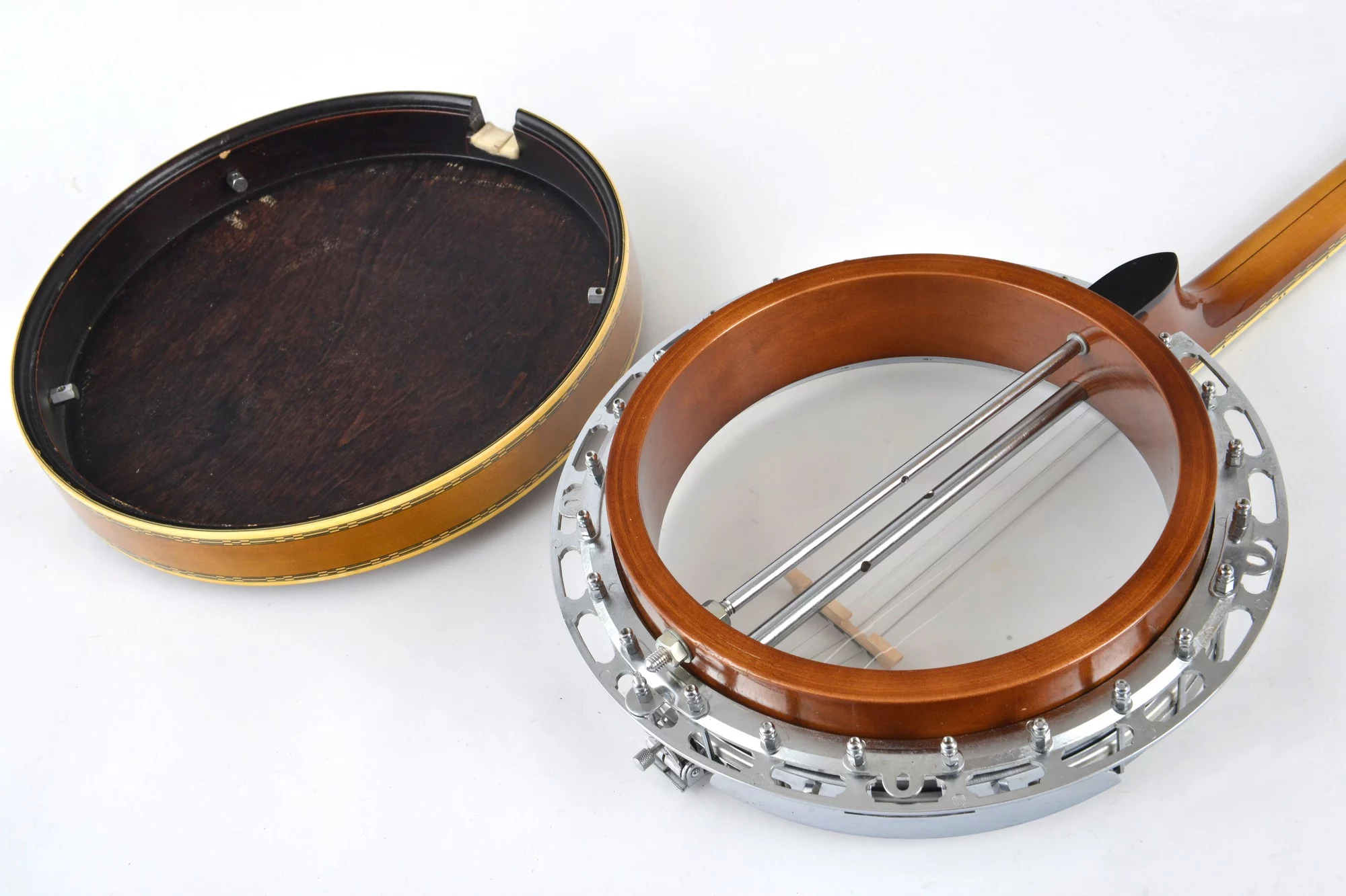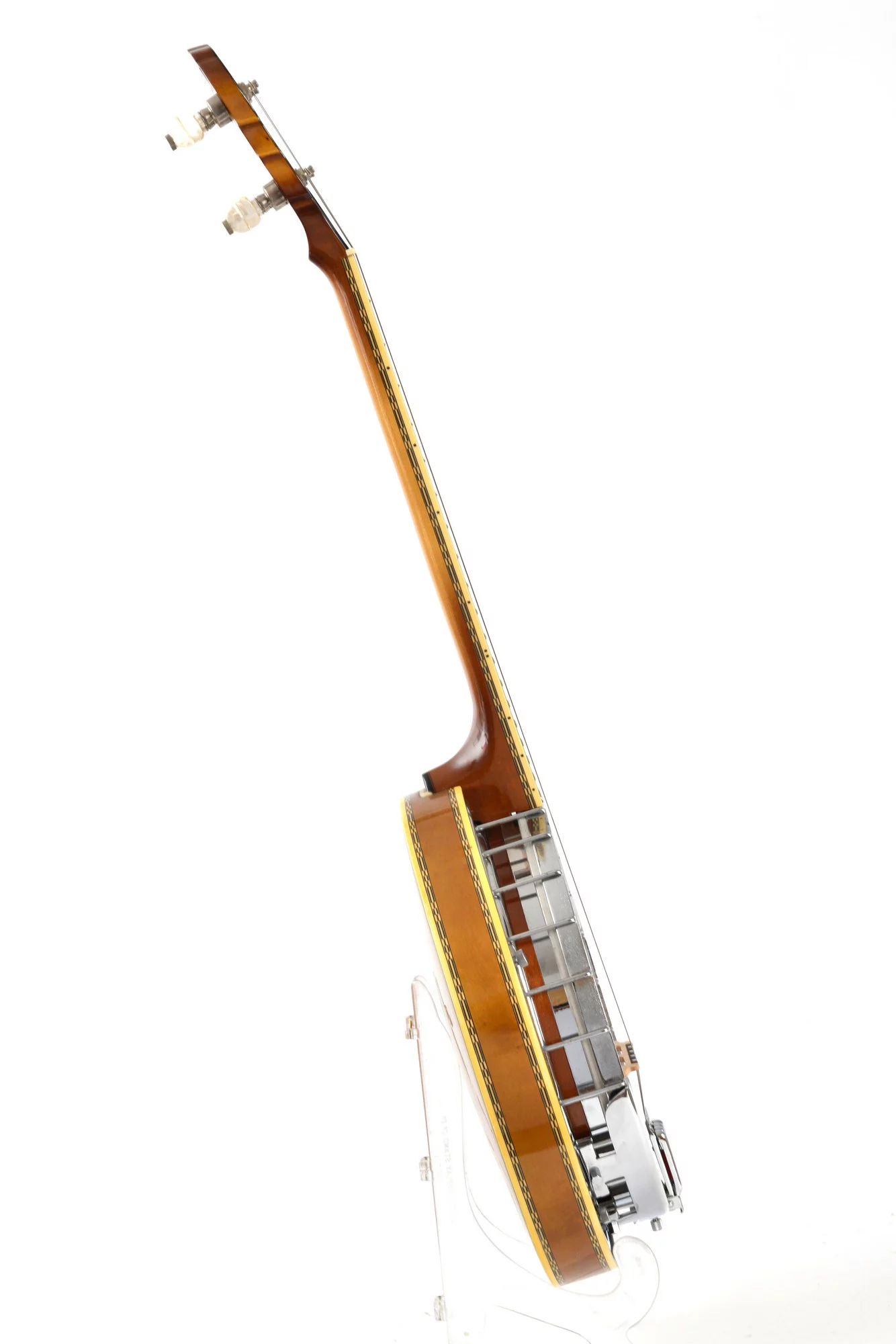 Beautifully preserved Japanese tenor banjo by Aria from the 1970s. A typical heavy Mastertone copy with flathead tone ring, which can easily keep up with the originals in terms of sound. Hearts and Flowers neck inlay, Clamshell tailpiece, CGDA stringing. Without case. Ready to play.