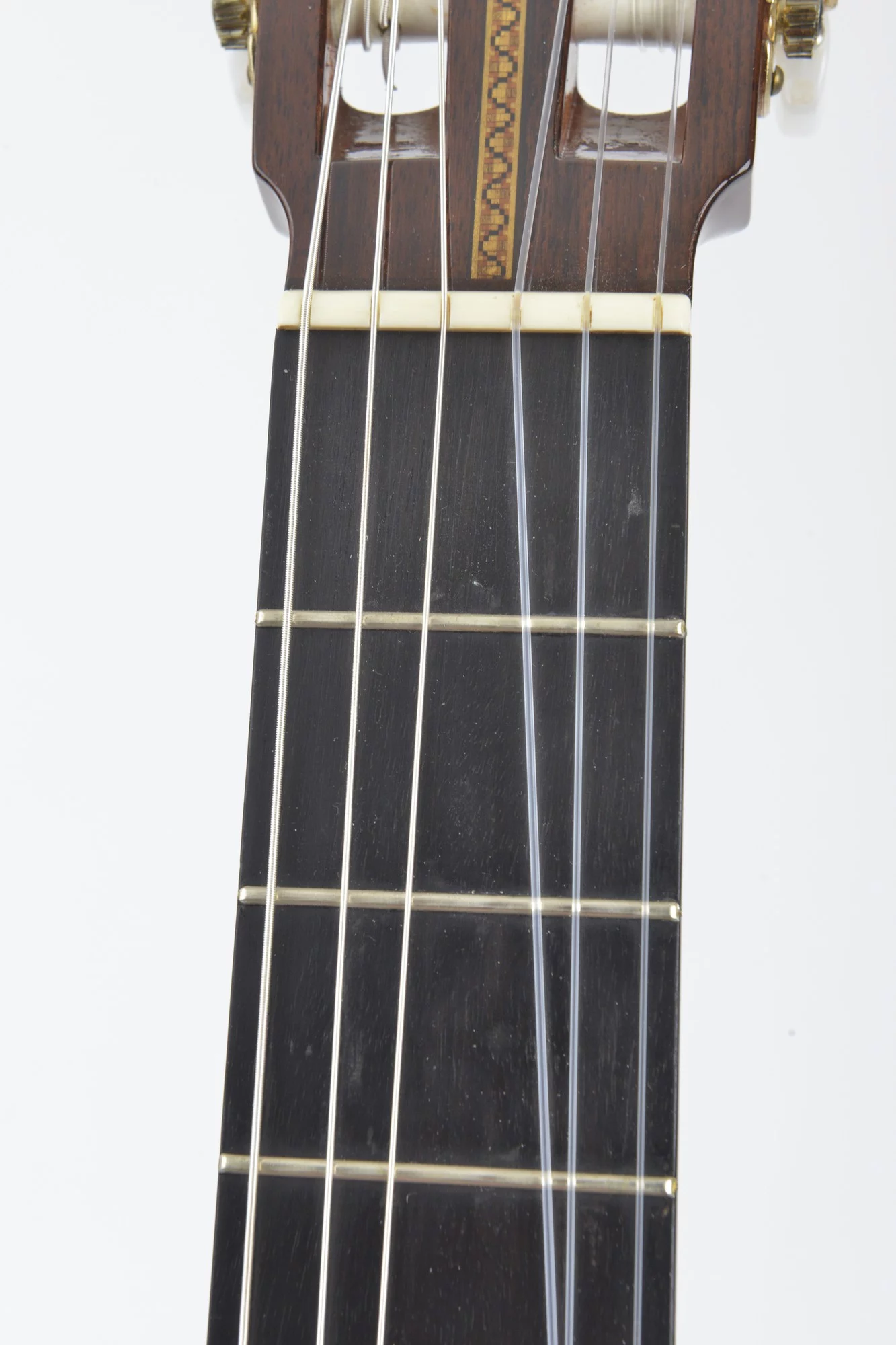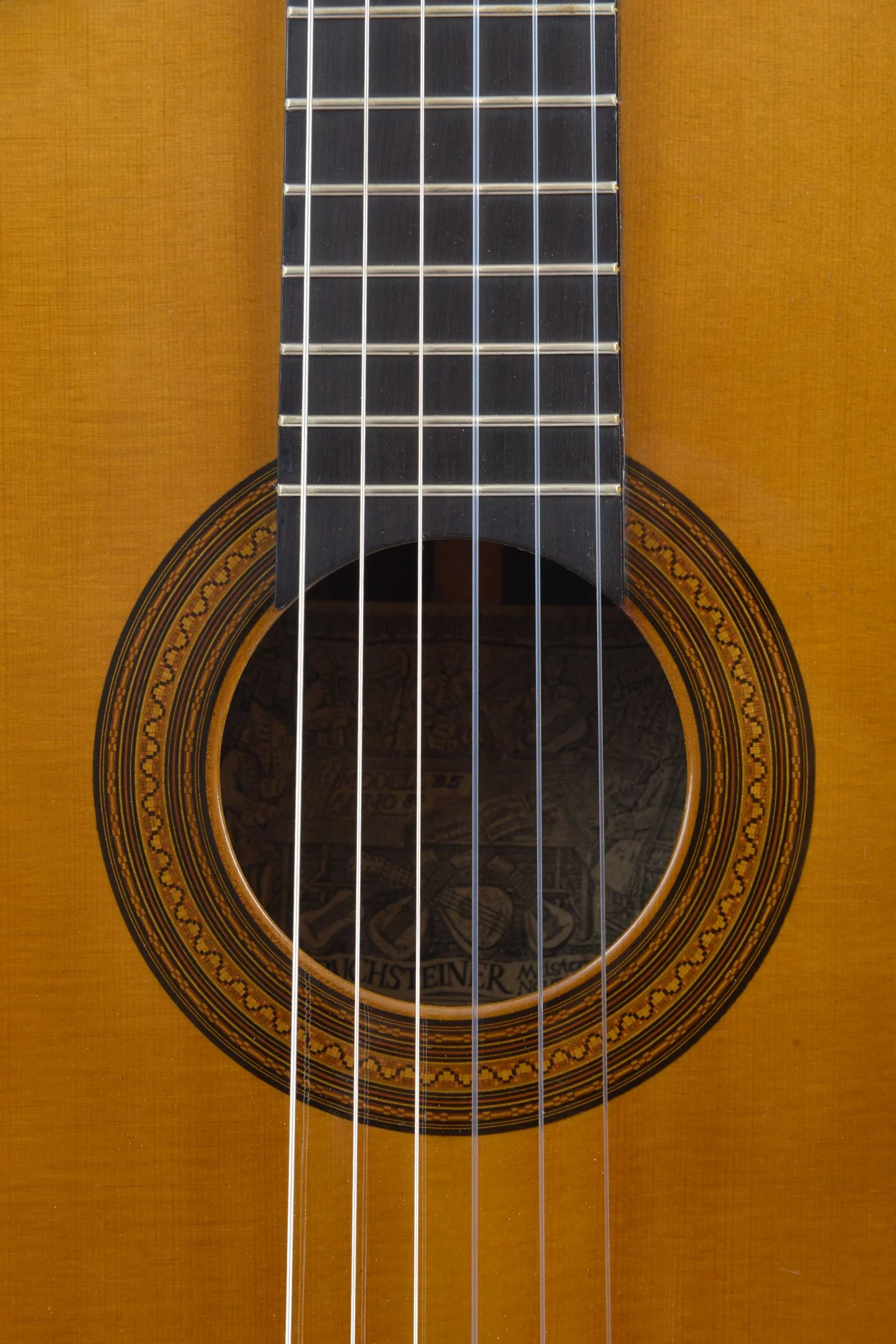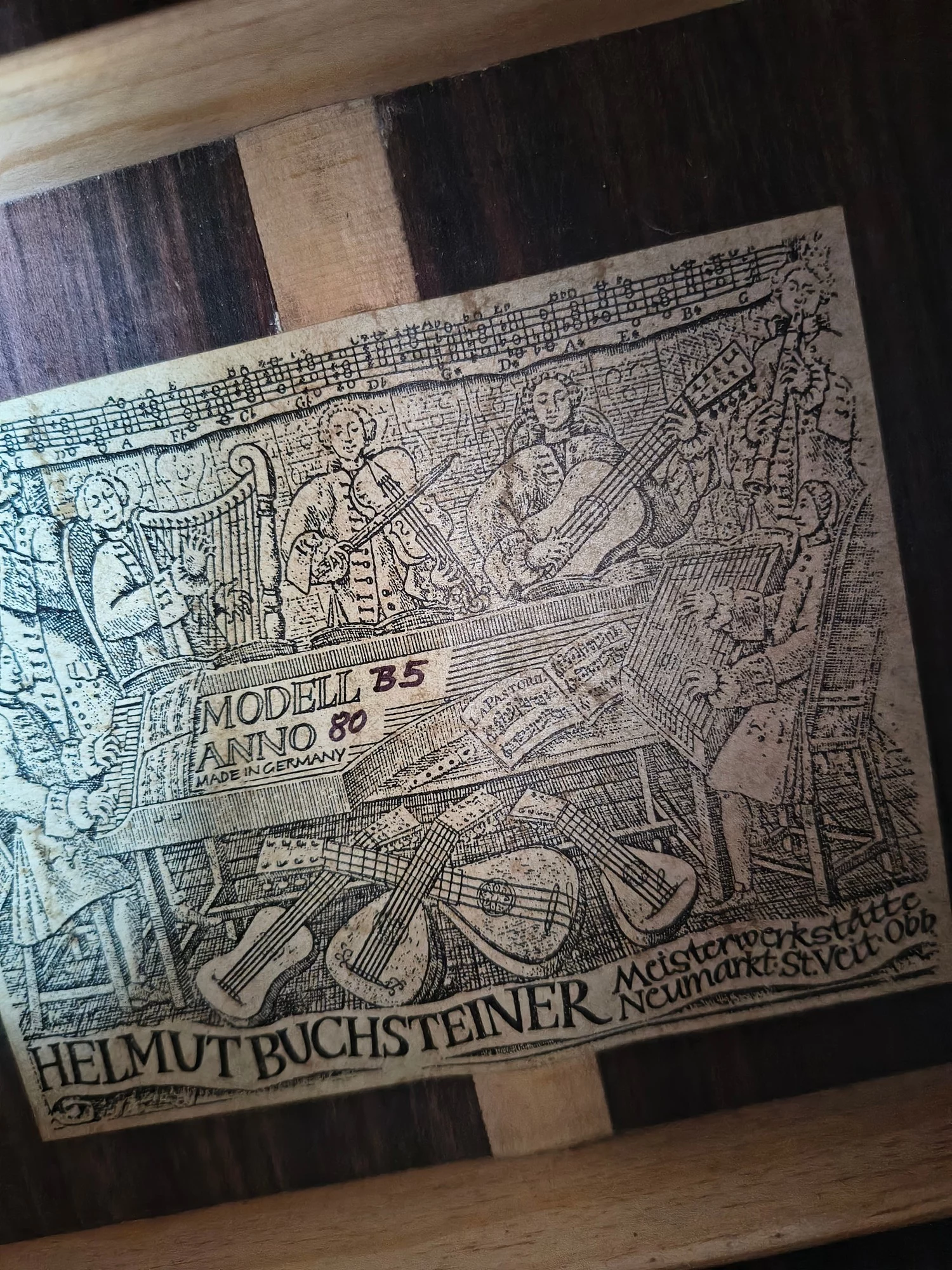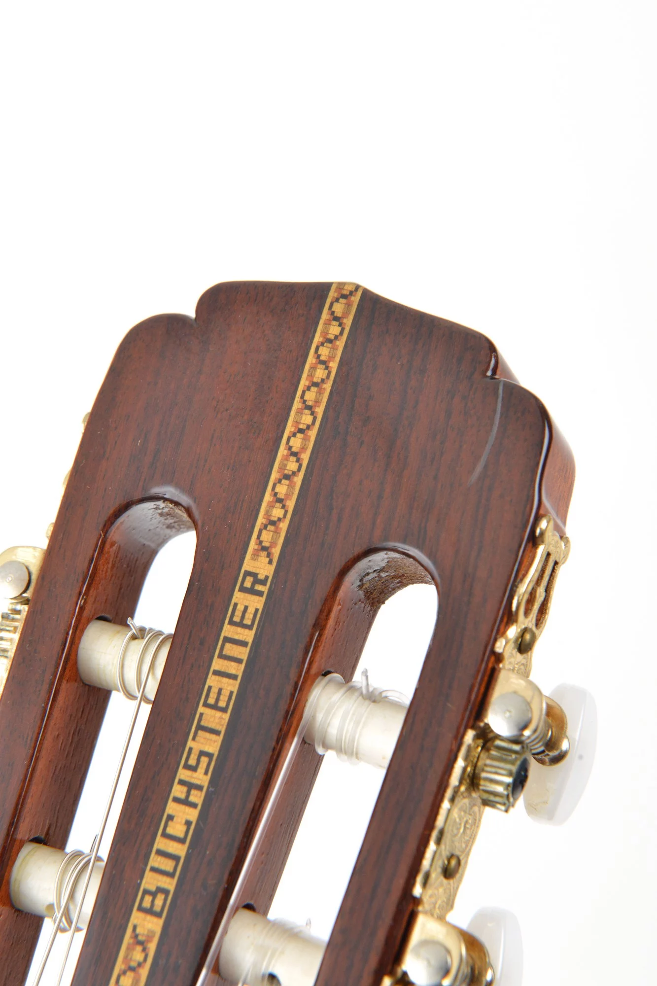 Diese klassische Meistergitarre besitzt eine Zederndecke auf einem Palisanderkorpus. Der Buchsteiner Schriftzug ist in der Kopfplatte eingelegt, das Label innen zeichnet die Gitarre als Model B5 aus dem Jahr 1980 aus.