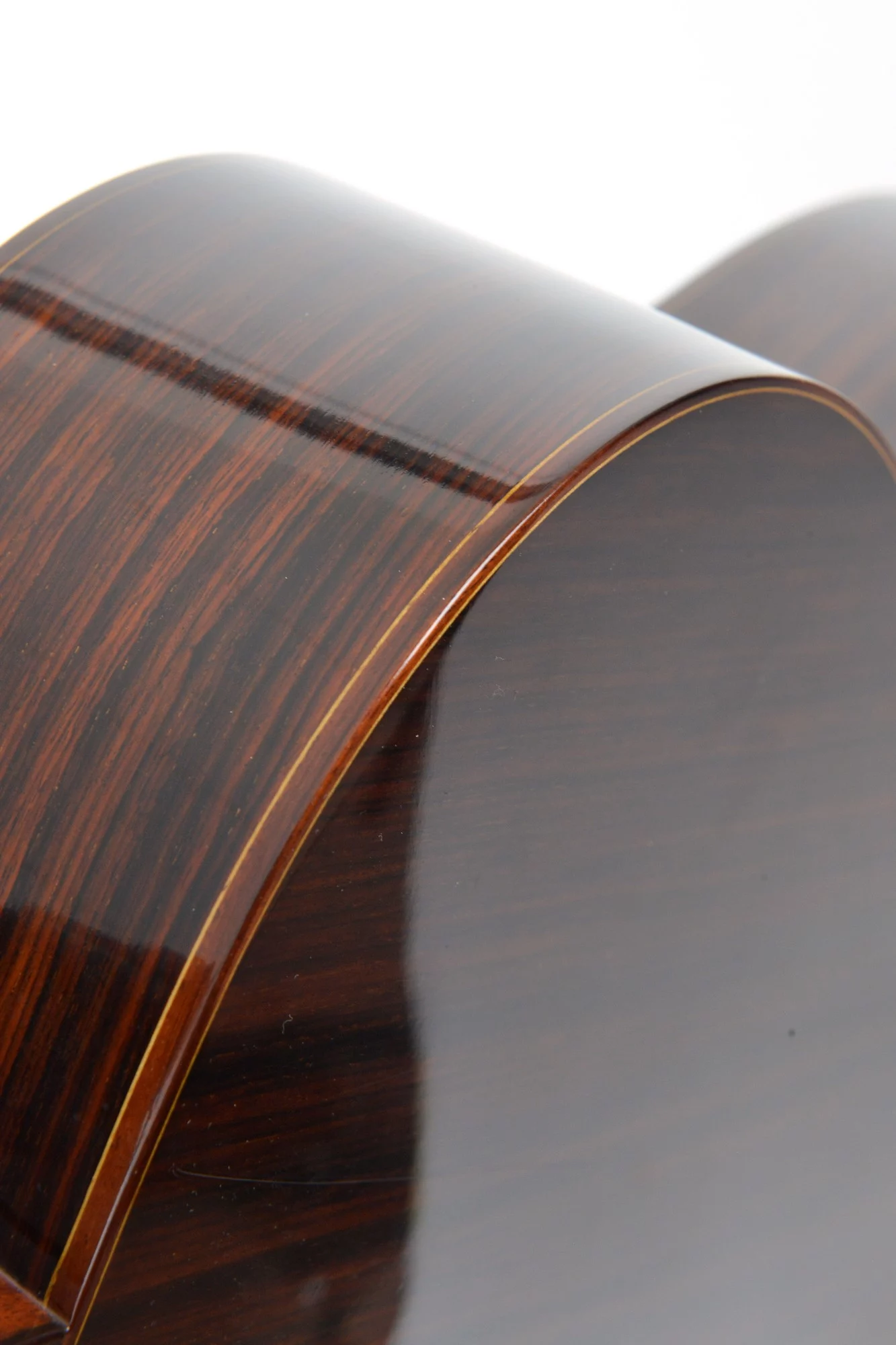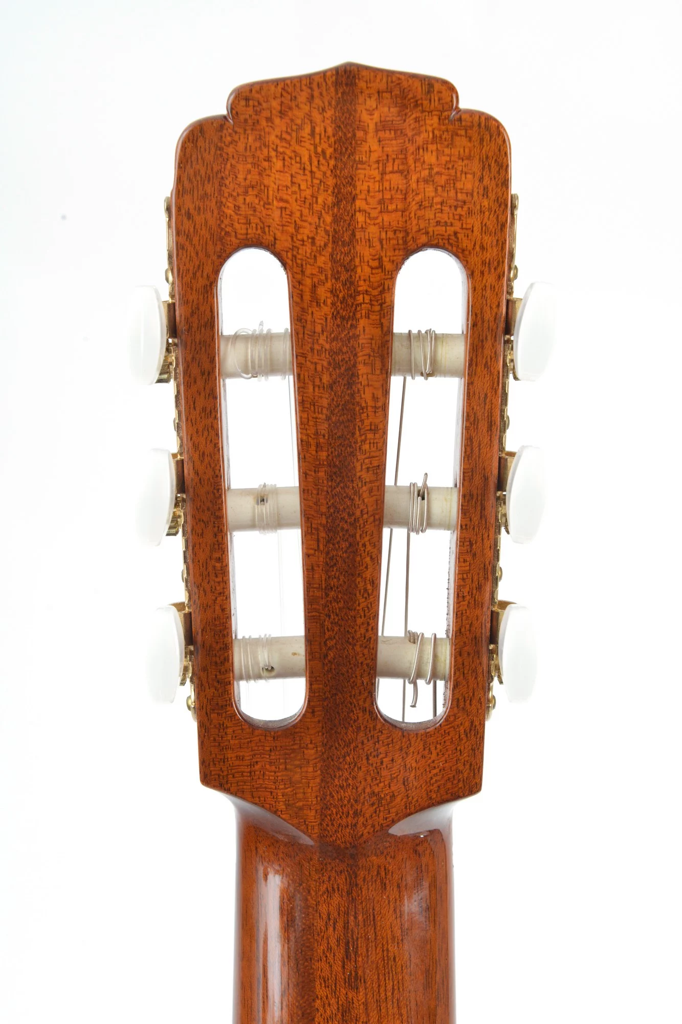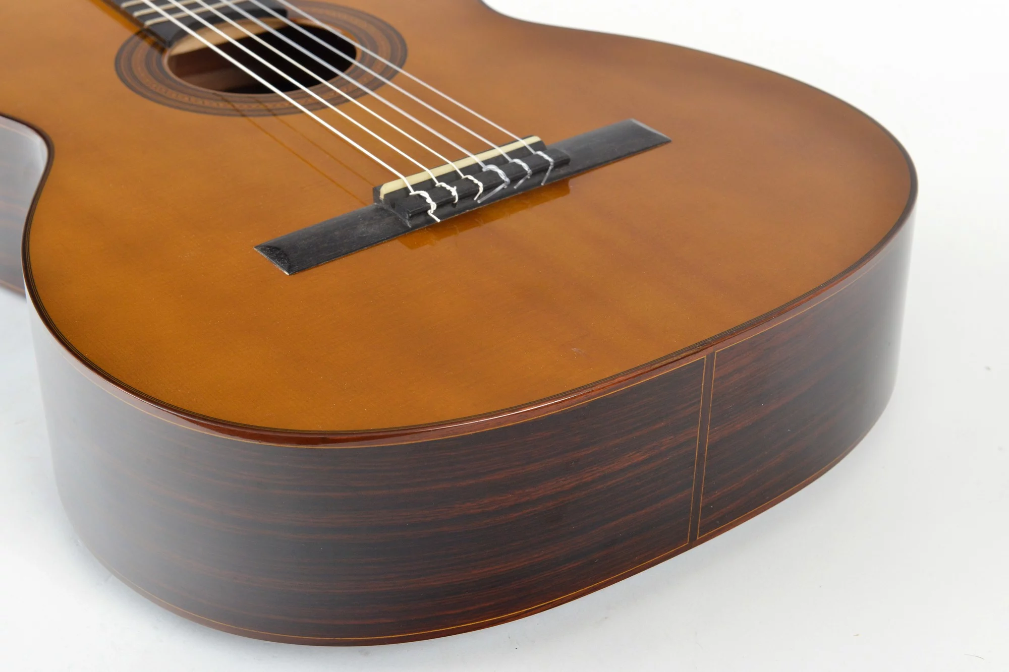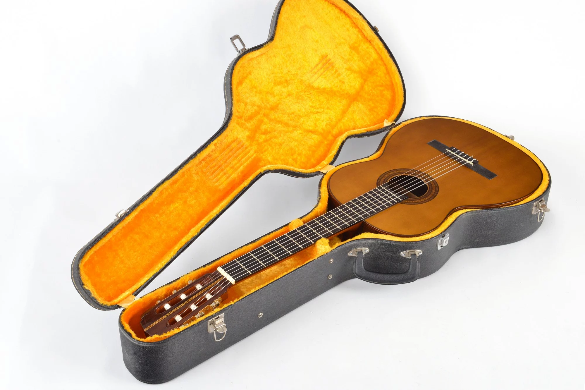 Diese klassische Meistergitarre besitzt eine Zederndecke auf einem Palisanderkorpus. Der Buchsteiner Schriftzug ist in der Kopfplatte eingelegt, das Label innen zeichnet die Gitarre als Model B5 aus dem Jahr 1980 aus.