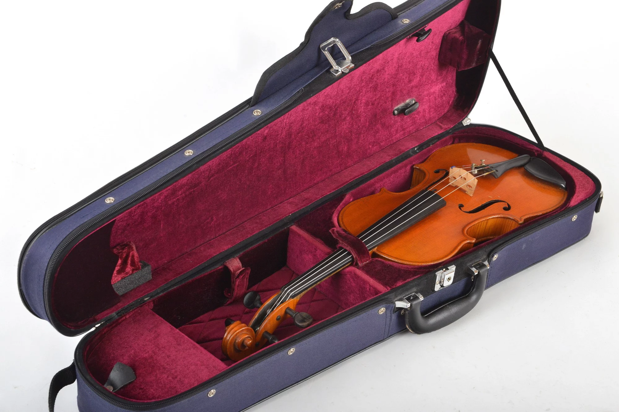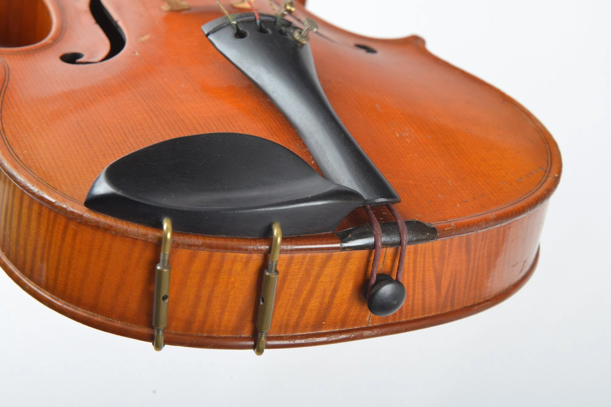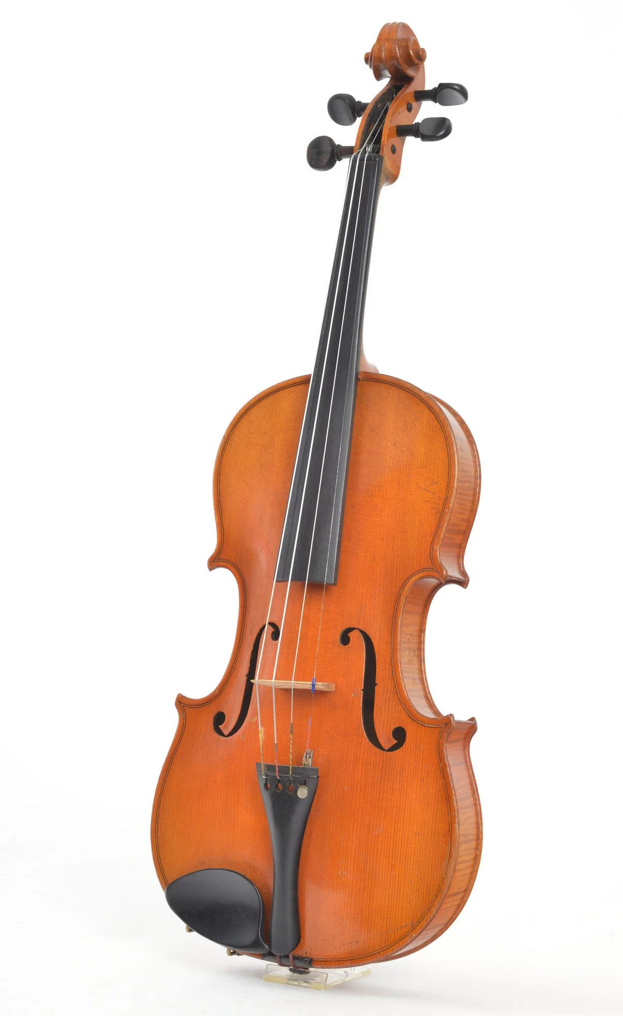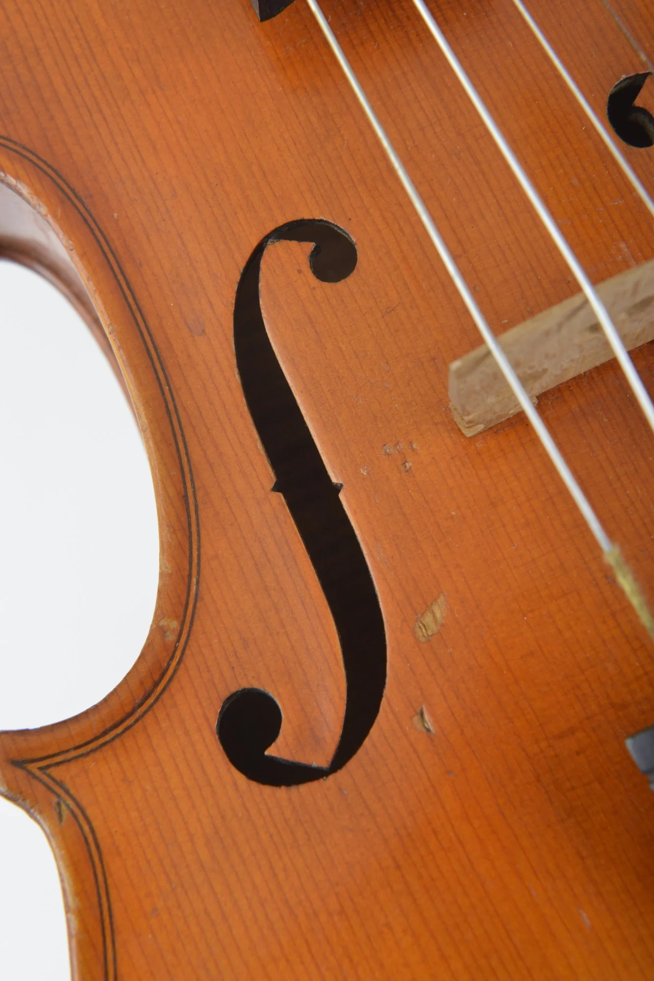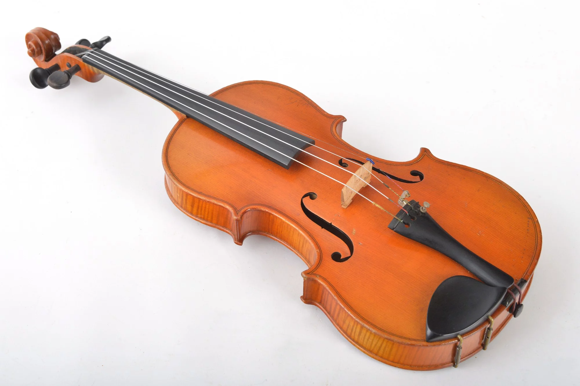 Unlabeled students´ instrument, probably from the Vogtland area, Germany. Well-built with and nicely flamed 2-piece back and sides. Playable condition including modern case.