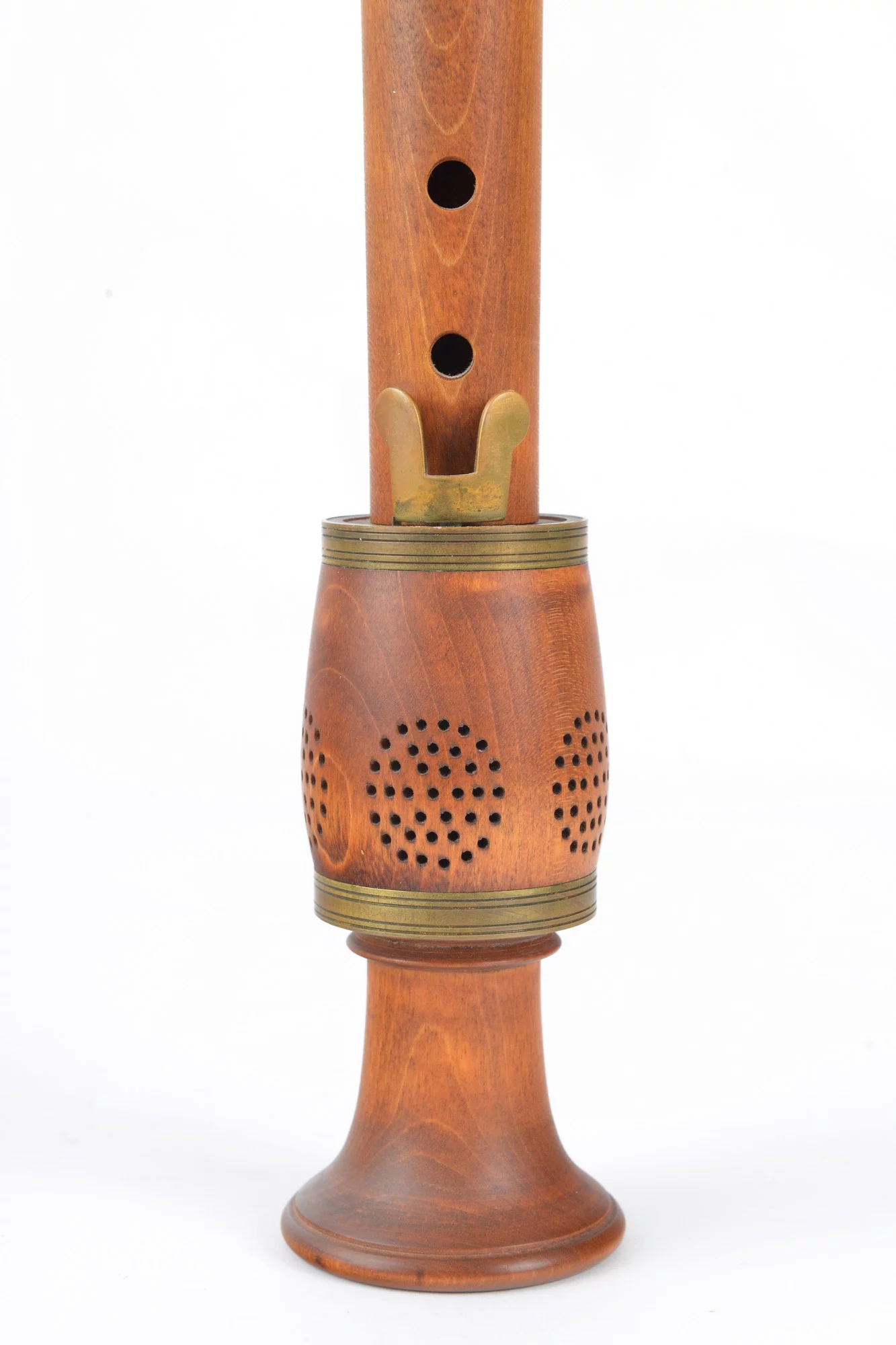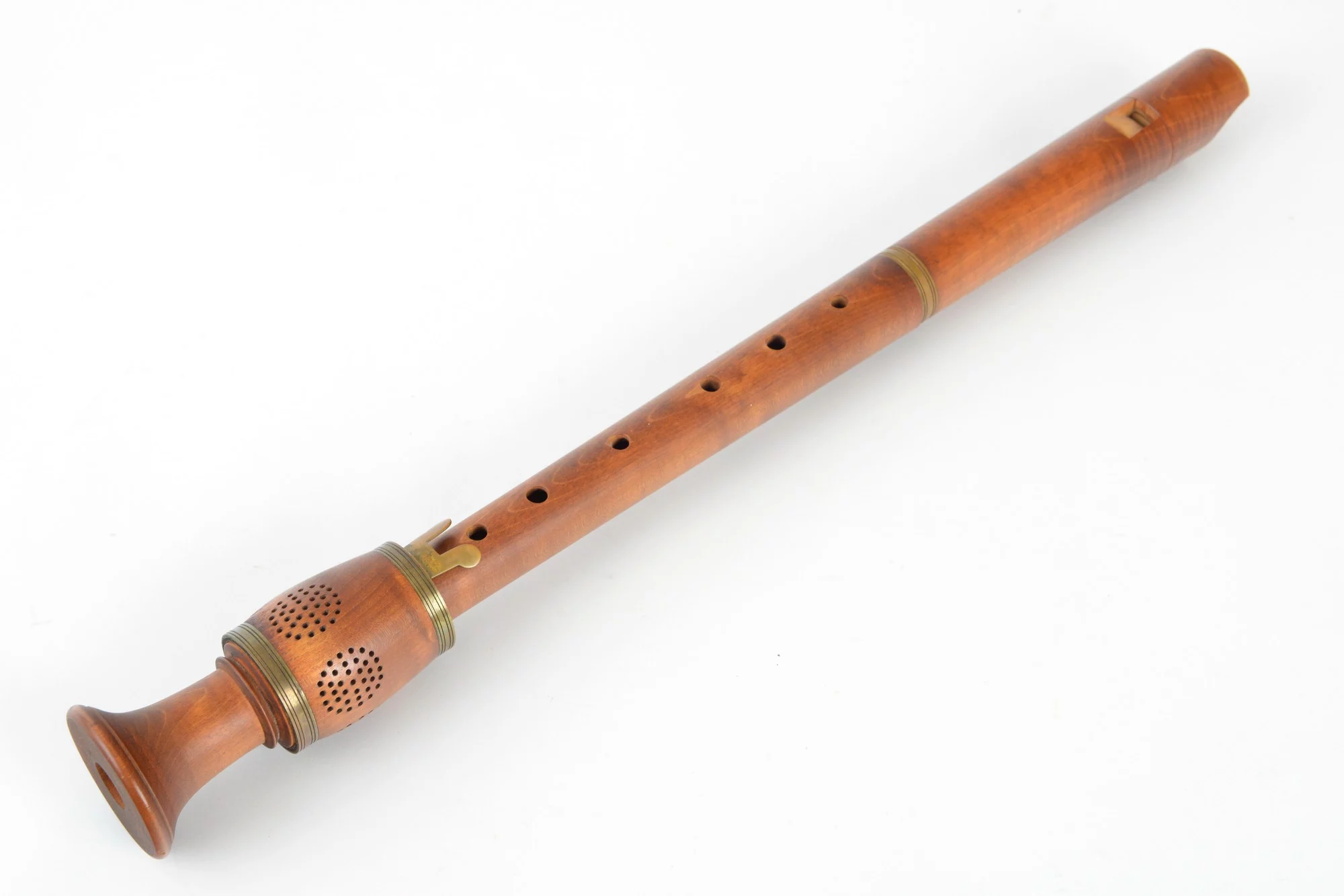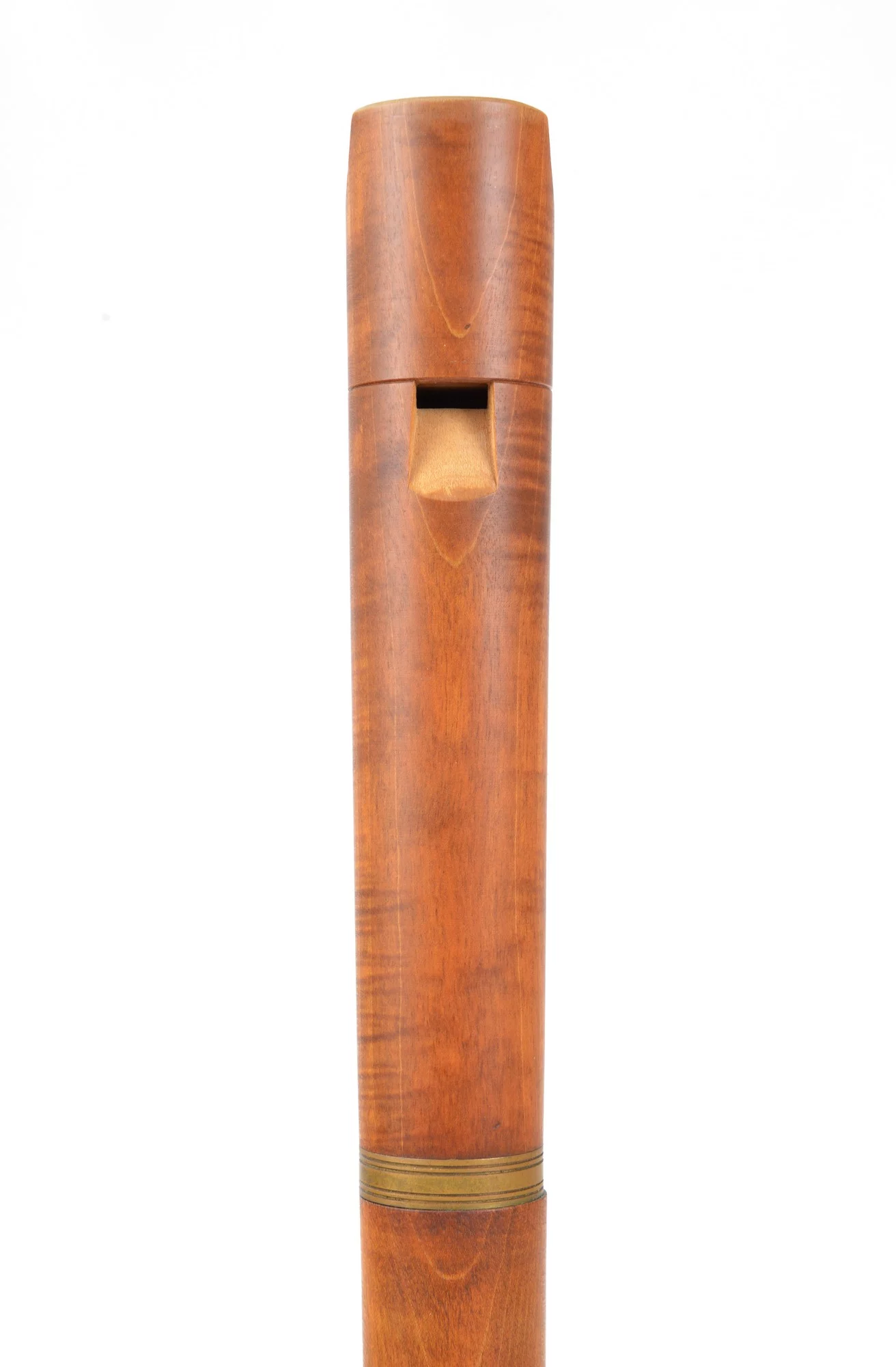 Three-piece instrument made from maple and brass with dovetail key and fontanelle.