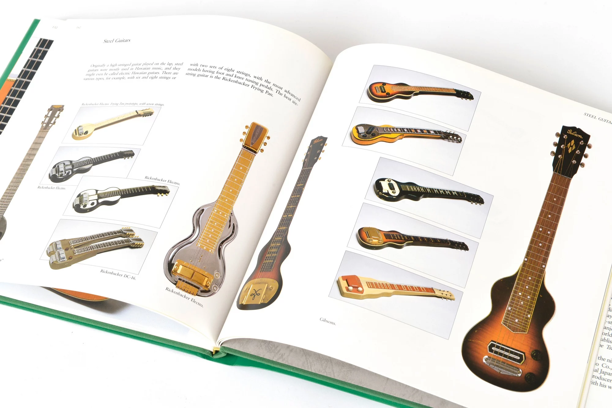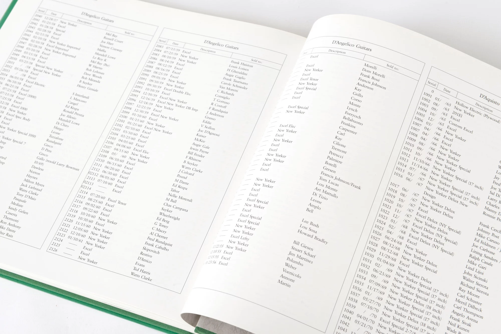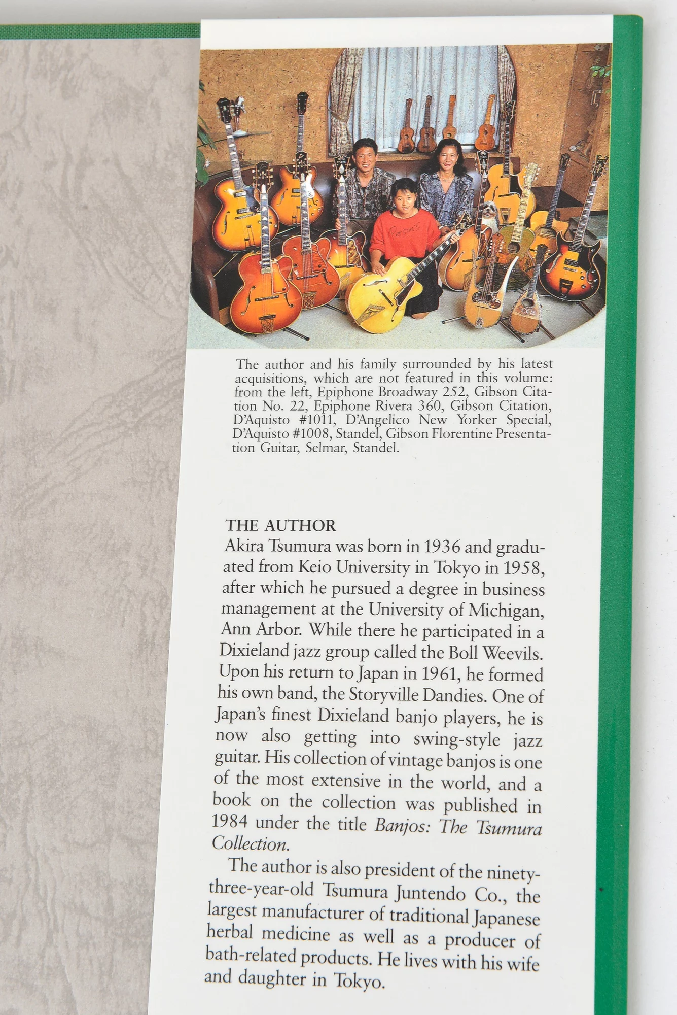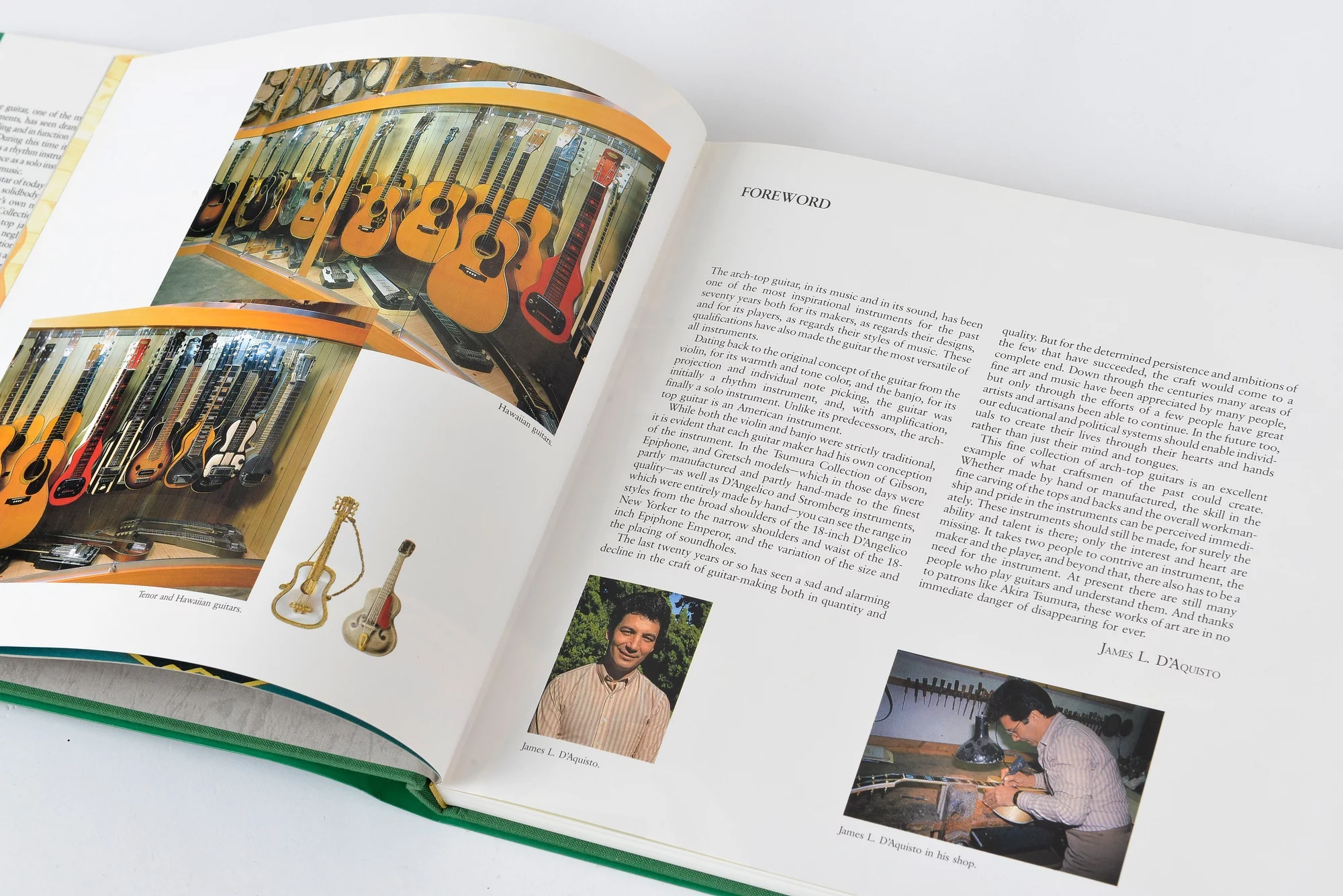 By Akira Tsumura. The limited edition, all color book with the green slipcover that has some of the finest guitars in the world between its covers. The book includes chapters on DAngelico, DAquisto, Gibson, Epiphone, Gretsch, Stromberg and a multitude of other makers such as Martin, Guild, Koontz and Fender. There are also sections on lap steels, ukuleles, and separate serial number listing on DAngelico and DAquisto production totals. A rare and beautiful book that is a must for every guitar library.