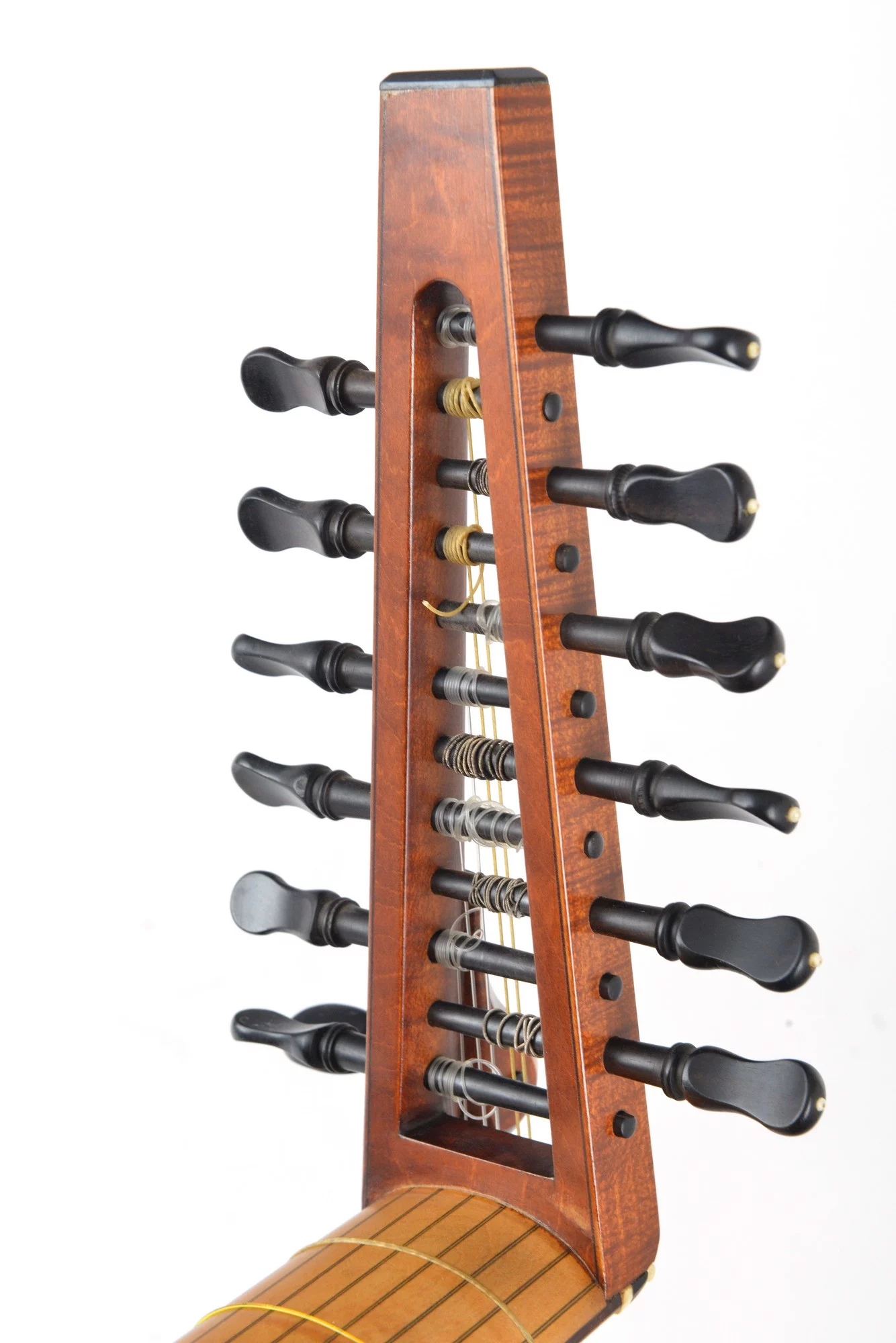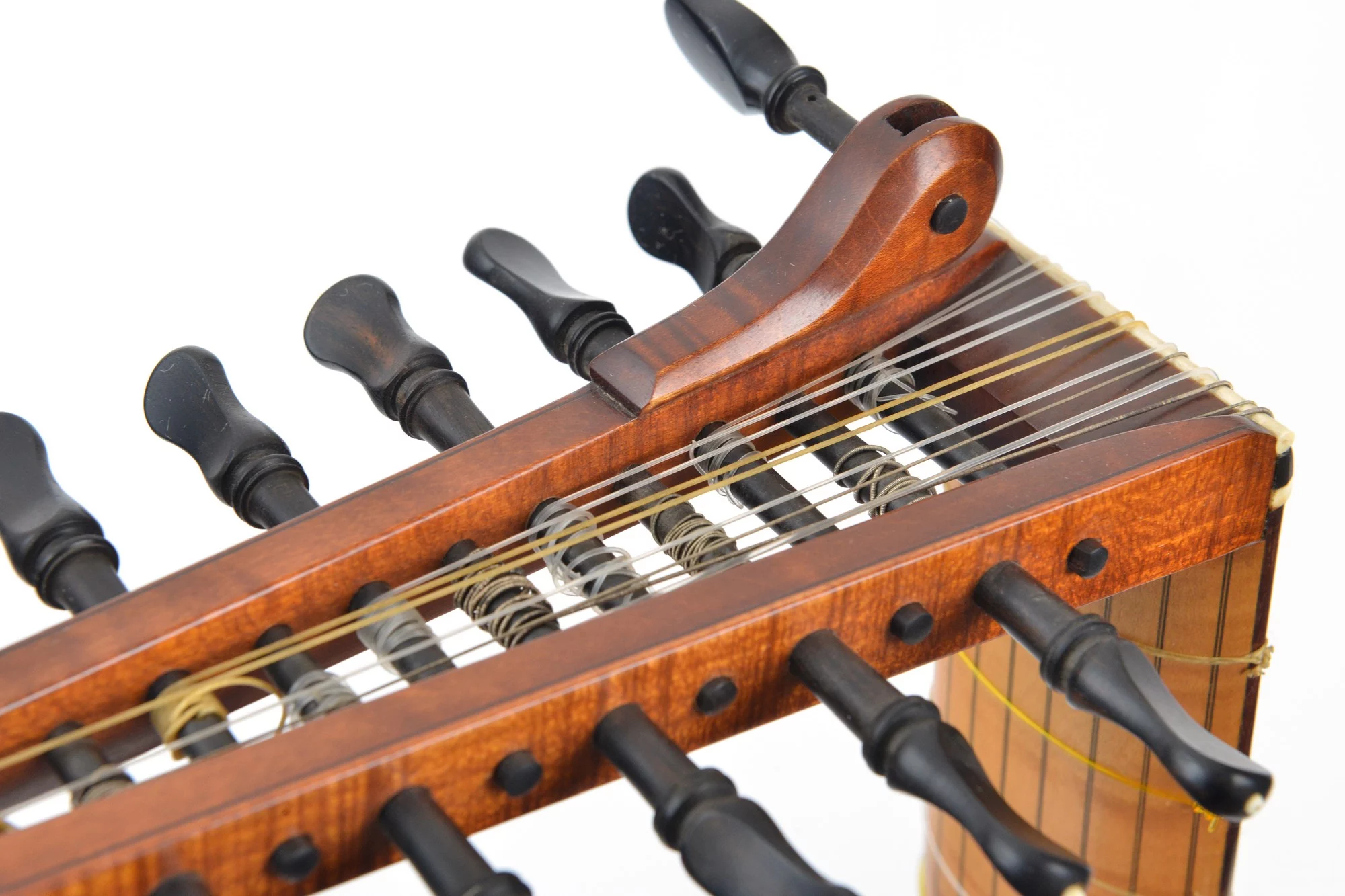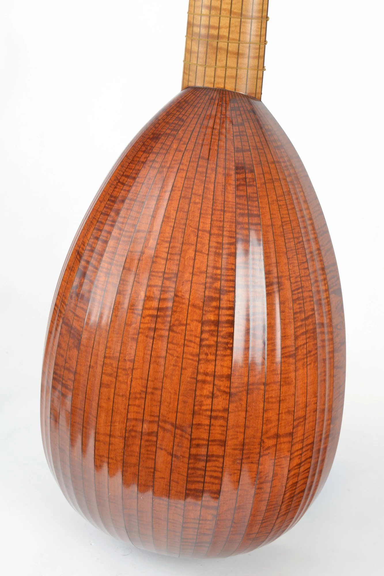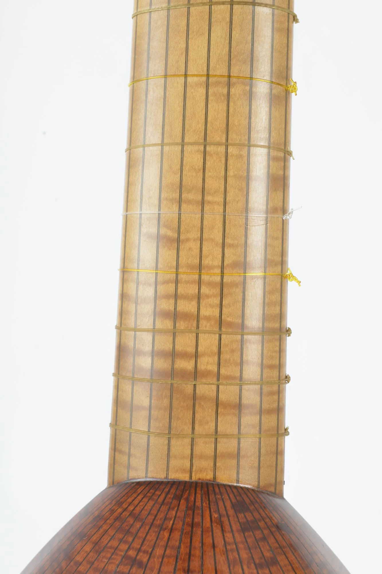 The body consists of 28 grooved(!), beautifully flamed maple veneers. Pegbox with a recessed chanterelle and ebony pegs.
