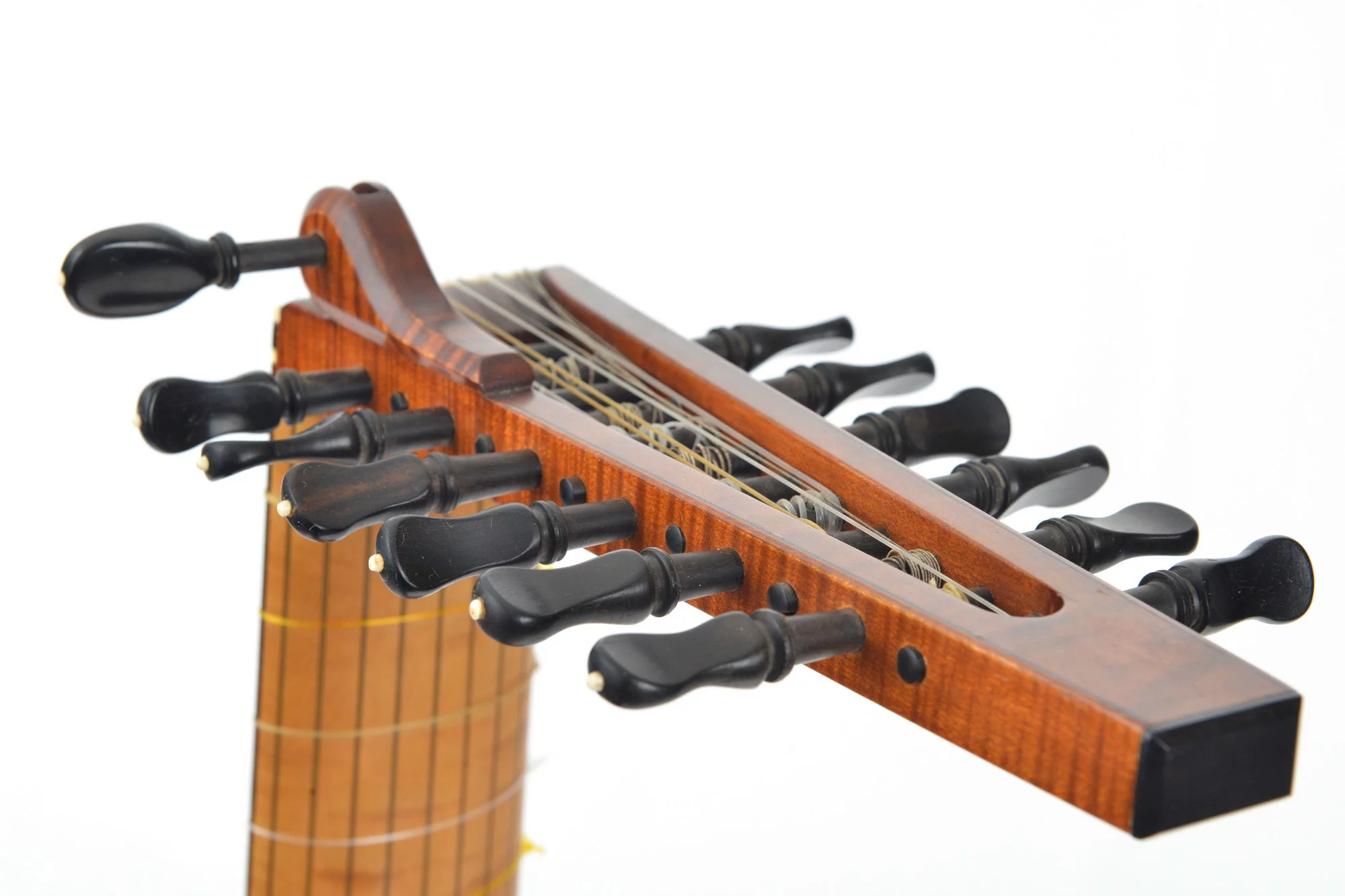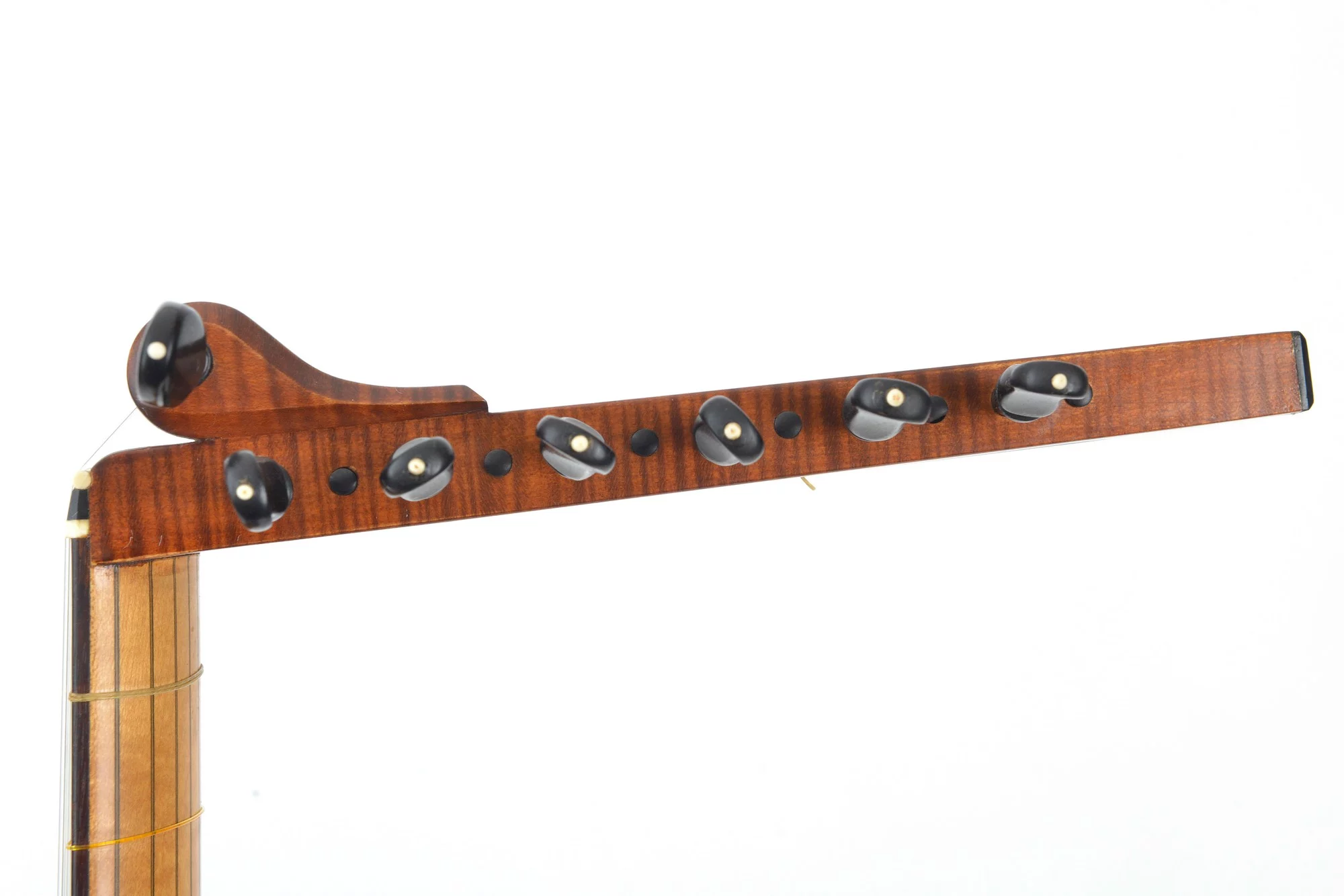 Der Korpus besteht aus 28 gekehlten(!), schön geflammten Ahorn-Spänen. Wirbelkasten mit abgesetzter Chanterelle und Ebenholz-Wirbeln.